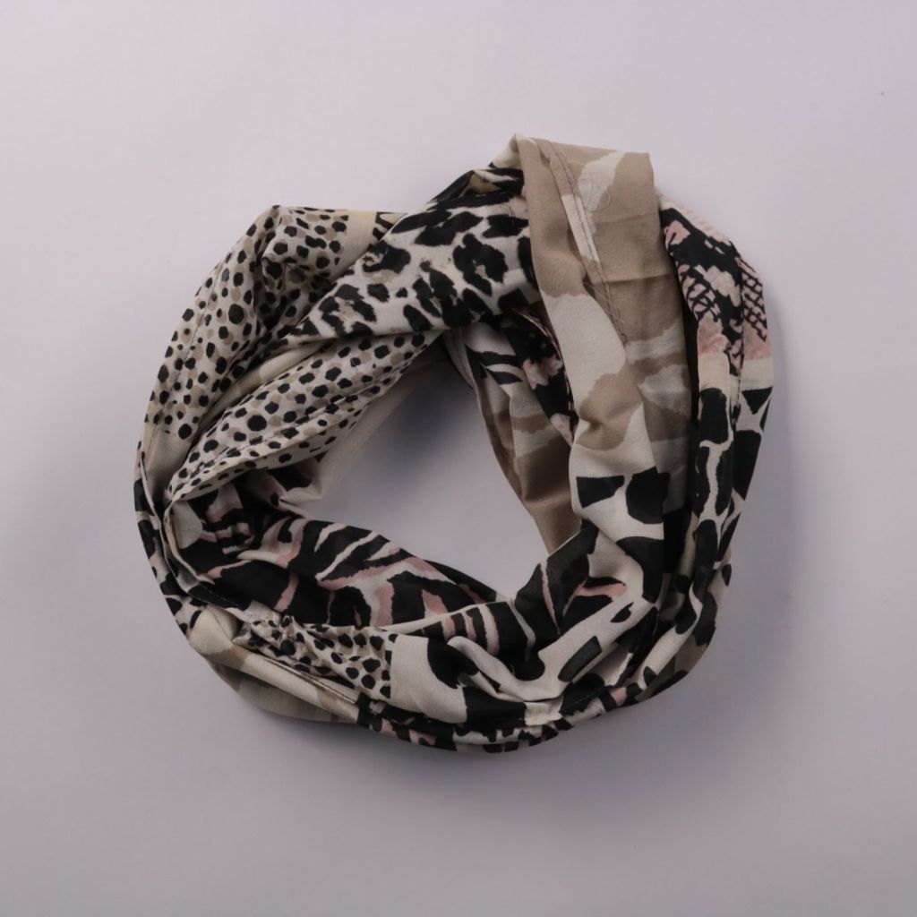 Шарф-снуд с принтом в стиле patchwork: сочетание анималистичных узоров в бежево-чёрной гамме с розовыми акцентами. Подойдёт для повседневных образов и путешествий, удобно носить на шее в прохладную погоду. Практичное преимущество — замкнутая форма, кот...