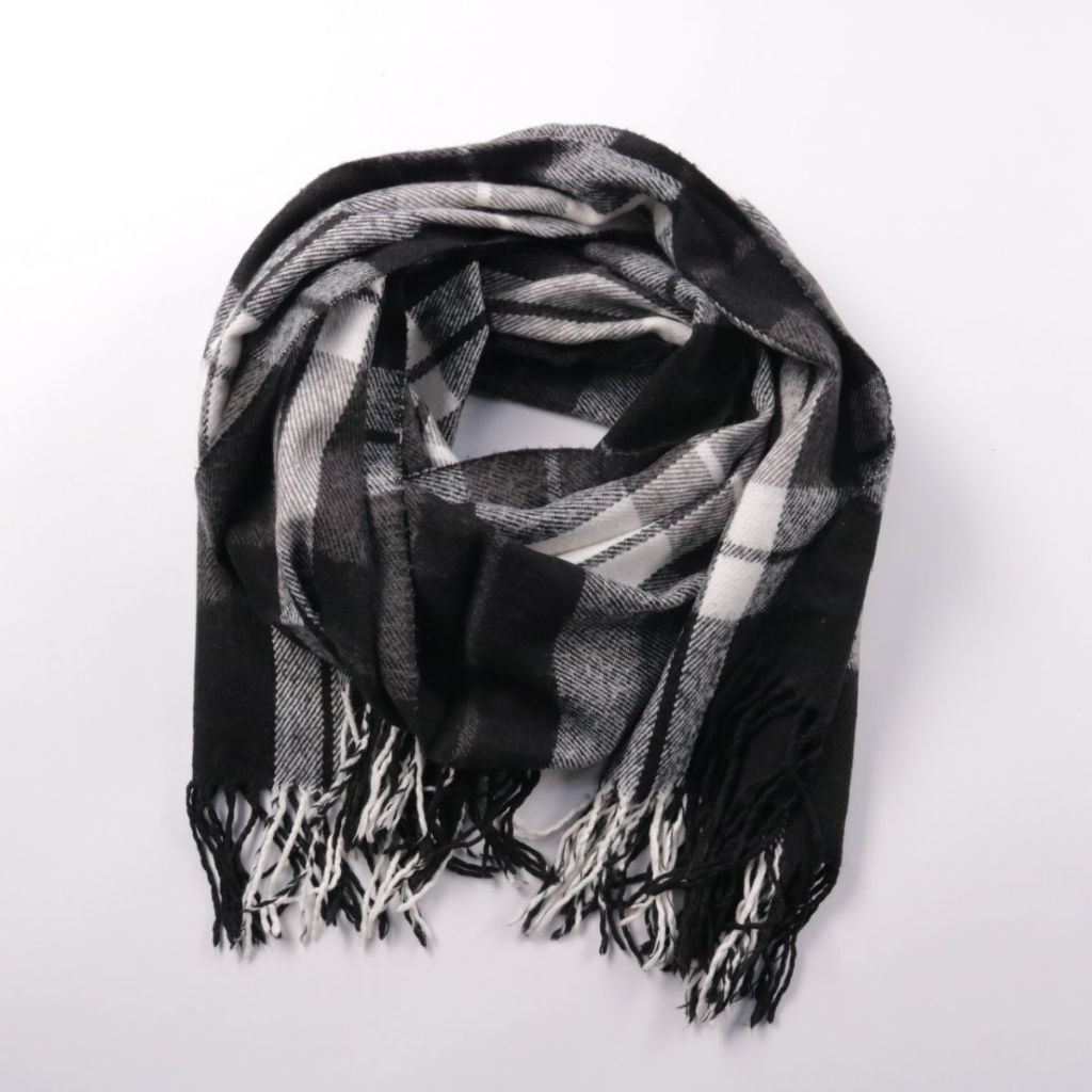Шарф в клетку с бахромой, без указания бренда. Подойдёт для повседневной носки в холодную погоду и легко сочетается с пальто или курткой. Достаточно длинный, чтобы наматывать в несколько оборотов и лучше защищать шею от ветра.