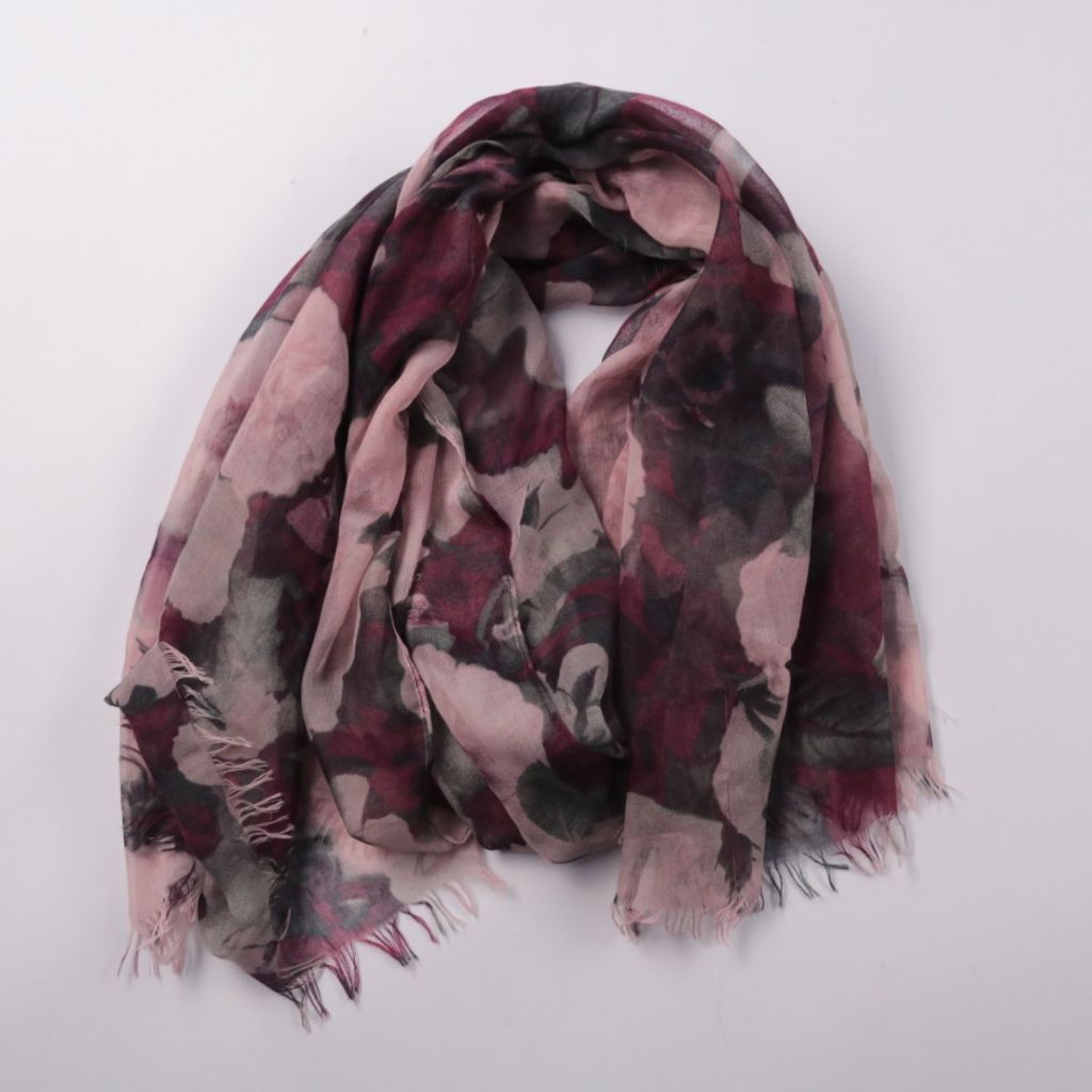 Лёгкий шарф с цветочным принтом в бордово-розовой гамме и тонкой бахромой по краю. Подойдёт для демисезона и прохладных летних вечеров, хорошо сочетается с однотонными пальто, куртками и жакетами. Ткань мягкая и компактно складывается, удобно брать с с...