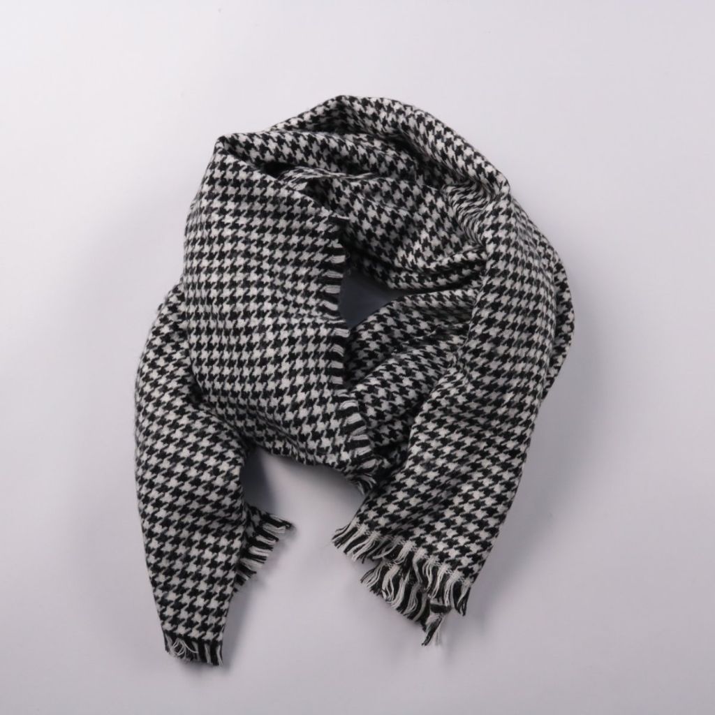 Шарф в чёрно-белую «гусиную лапку» с бахромой по краю. Подойдёт для повседневных и более строгих образов в прохладную погоду. Хорошо драпируется и удобно укладывается вокруг шеи.