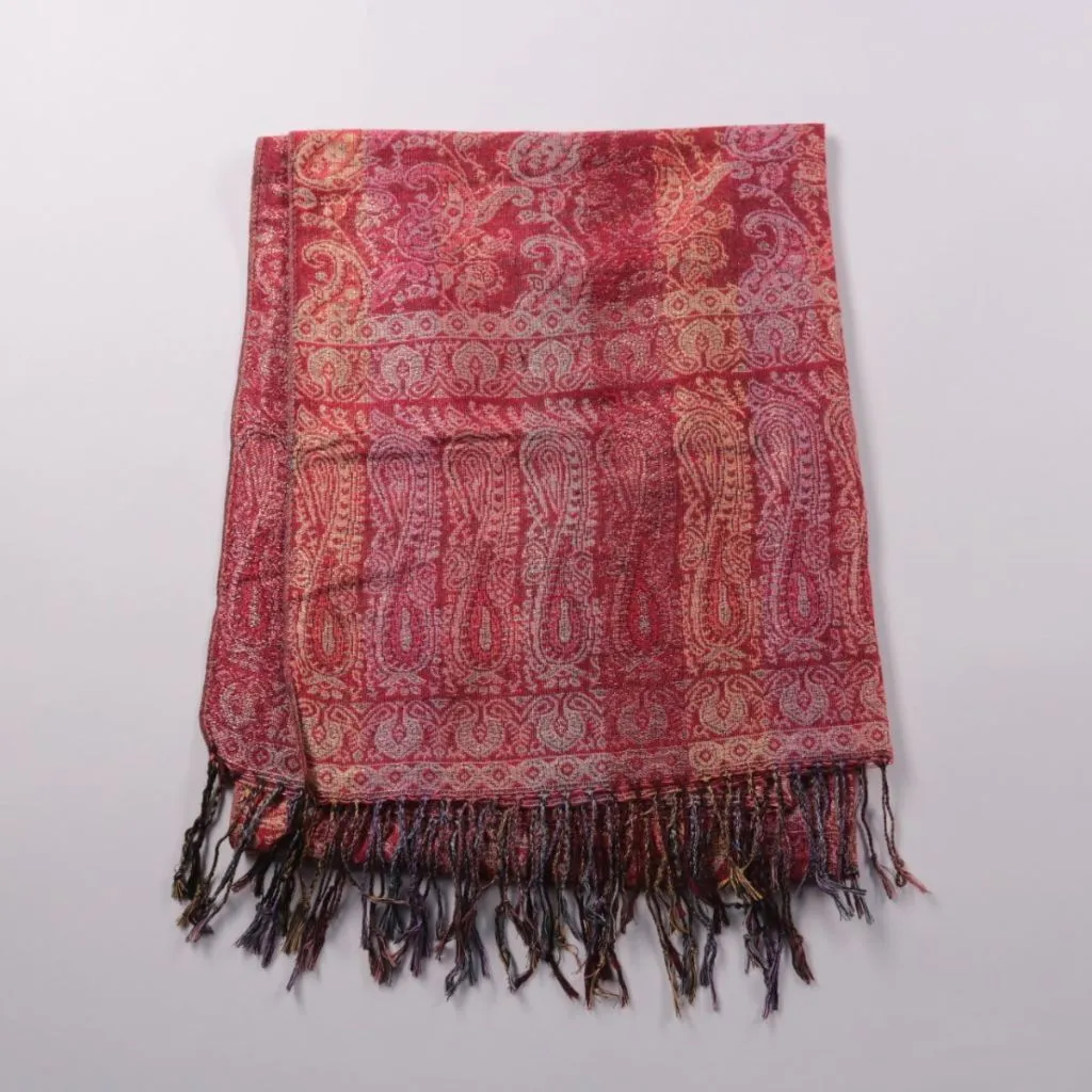 Шарф-палантин с узором пейсли в бордово-красной гамме и бахромой по краю. Подойдёт для повседневных образов и поездок, когда нужно добавить тепла и цвета. Можно носить как шарф или накидывать на плечи, он легко складывается и не занимает много места.