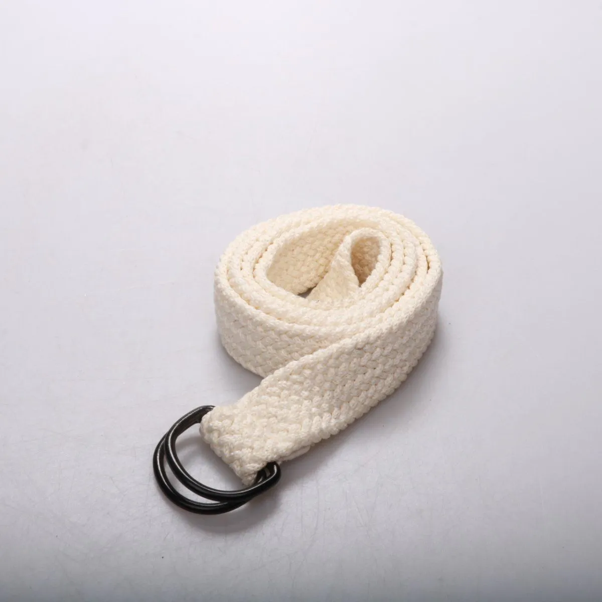 Текстильный ремень светлого (бежевого) цвета с двойной металлической пряжкой. Подойдёт для повседневных образов с джинсами, брюками и шортами. Лёгкий и быстро регулируется по талии.