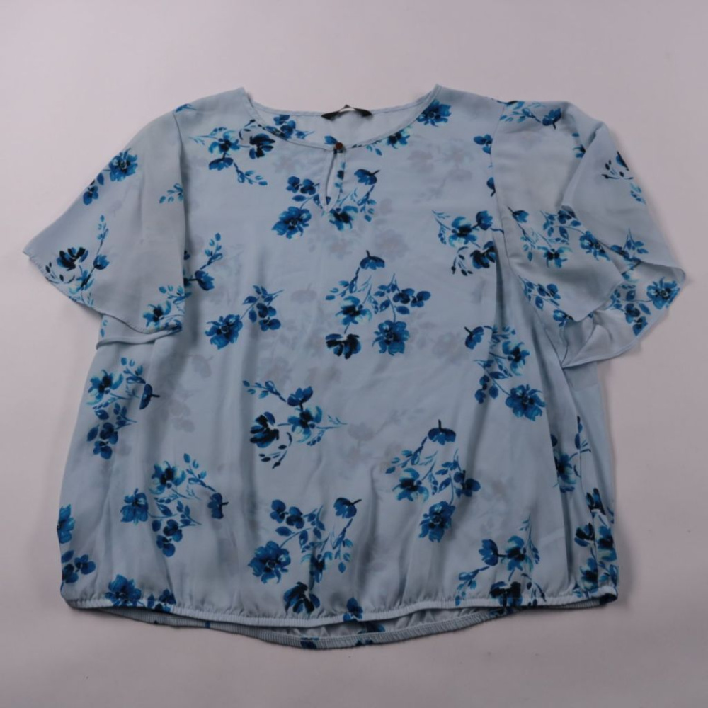 Лёгкая блузка George голубого цвета с цветочным принтом и короткими рукавами с воланами. Подойдёт для тёплой погоды, прогулок и праздников, хорошо сочетается с юбкой или шортами. Низ на мягкой резинке, поэтому удобно сидит и не задирается.