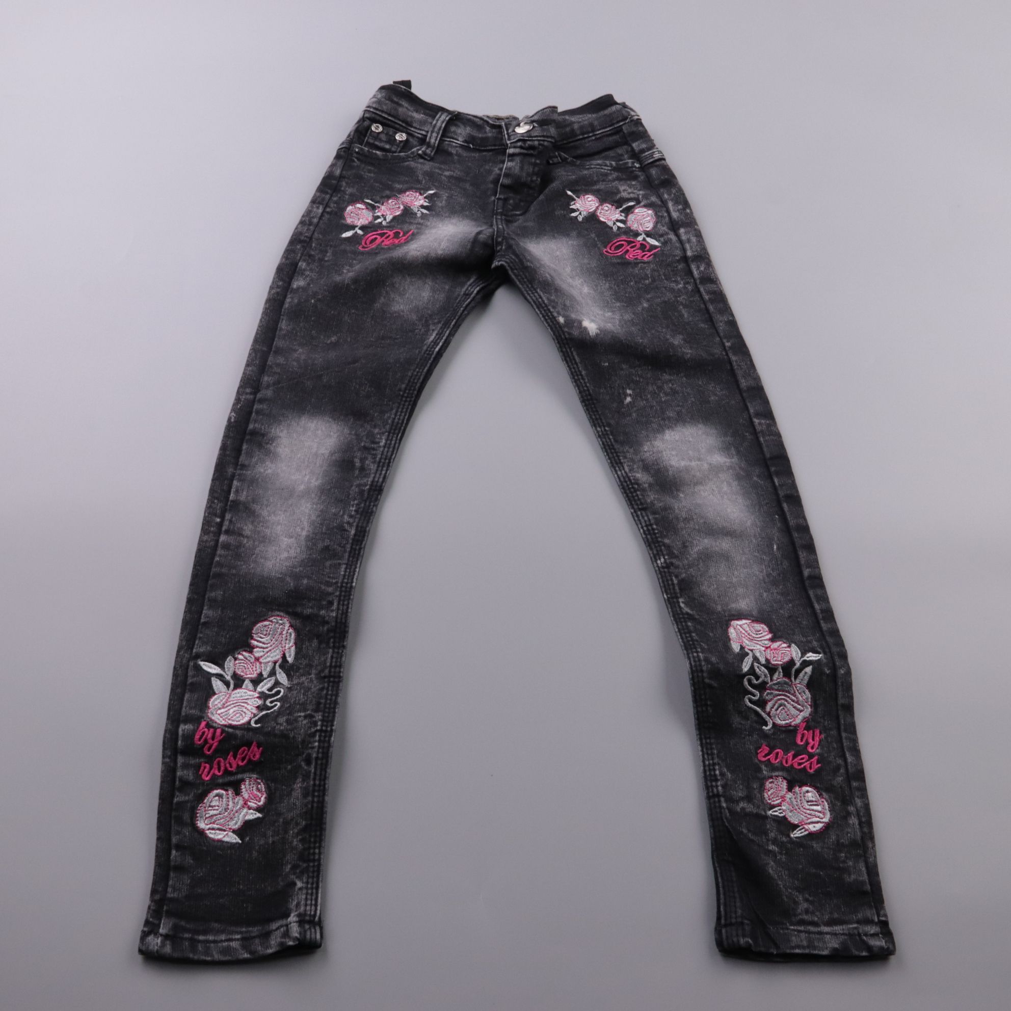 Чёрные джинсы с вышивкой роз и эффектом варки. Подойдут для повседневных образов и прогулок, хорошо сочетаются с однотонными футболками и худи. Плотный деним практичен в носке и менее маркий.