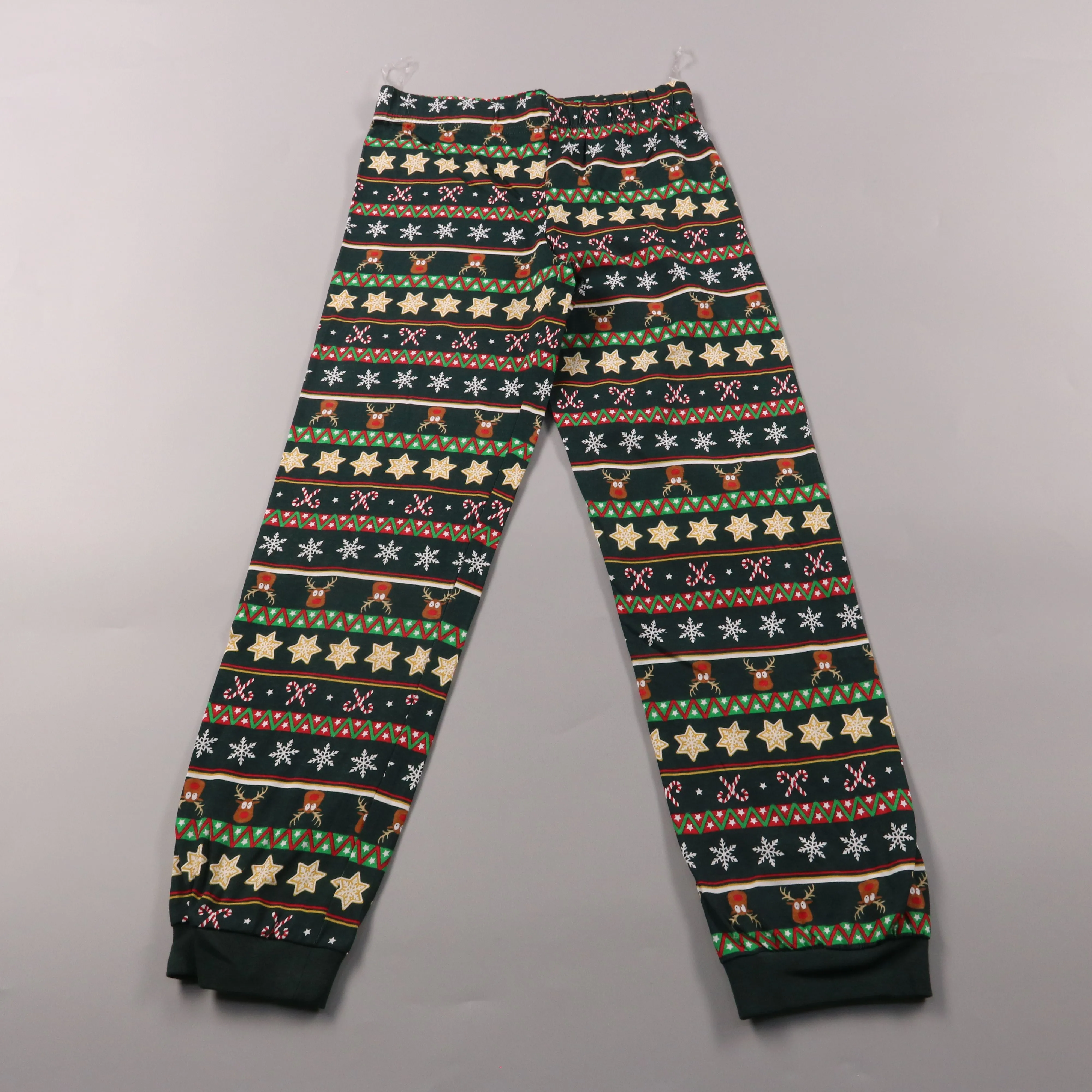 Детские брюки без указанного бренда с новогодним принтом (олени, снежинки и звёзды) и манжетами по низу. Подойдут для дома, прогулок и праздничных зимних дней. Эластичный пояс обеспечивает удобную посадку и не сковывает движения.