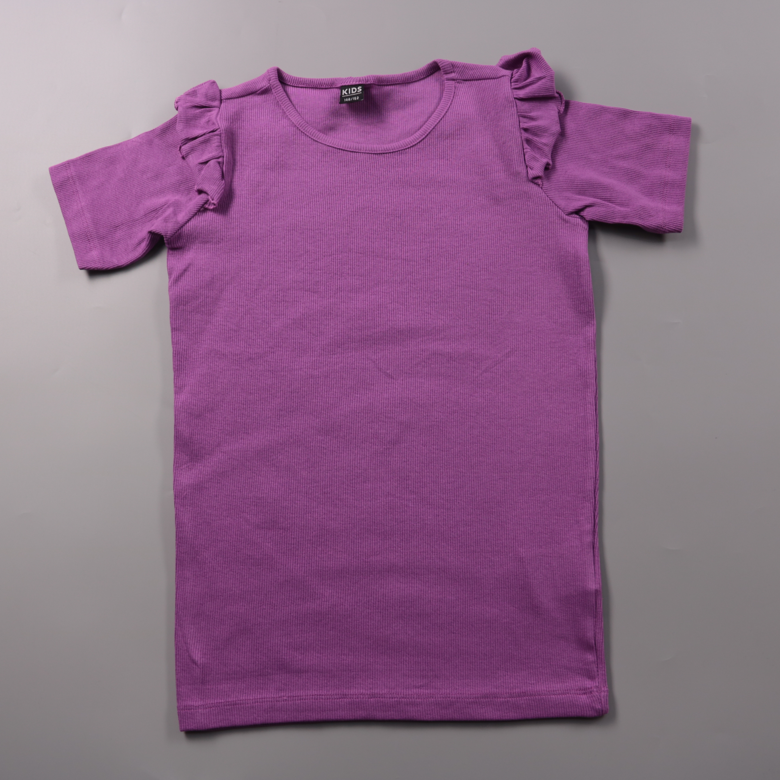 Футболка KIDS фиолетового цвета из мягкого трикотажа в рубчик, с коротким рукавом и рюшами на плечах. Подойдёт для школы, прогулок и повседневных образов в любое время года. Ткань тянется за счёт эластана и комфортно садится по фигуре.