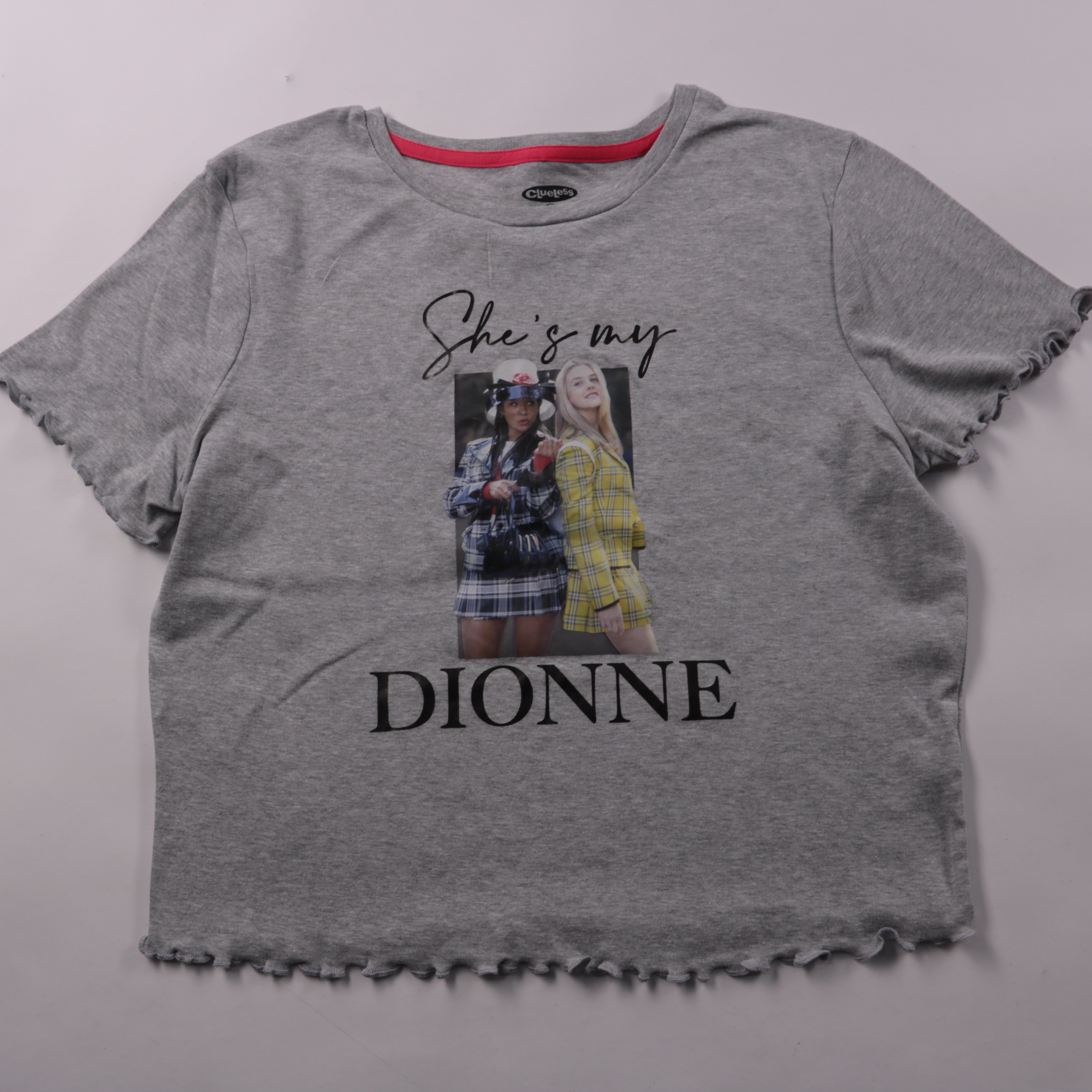 Серая футболка Clueless с принтом и надписью «DIONNE», с волнистыми краями по рукавам и низу. Подойдёт для повседневных летних образов и прогулок, легко сочетается с джинсами и юбками. Мягкий трикотаж приятен к телу и удобен в носке.