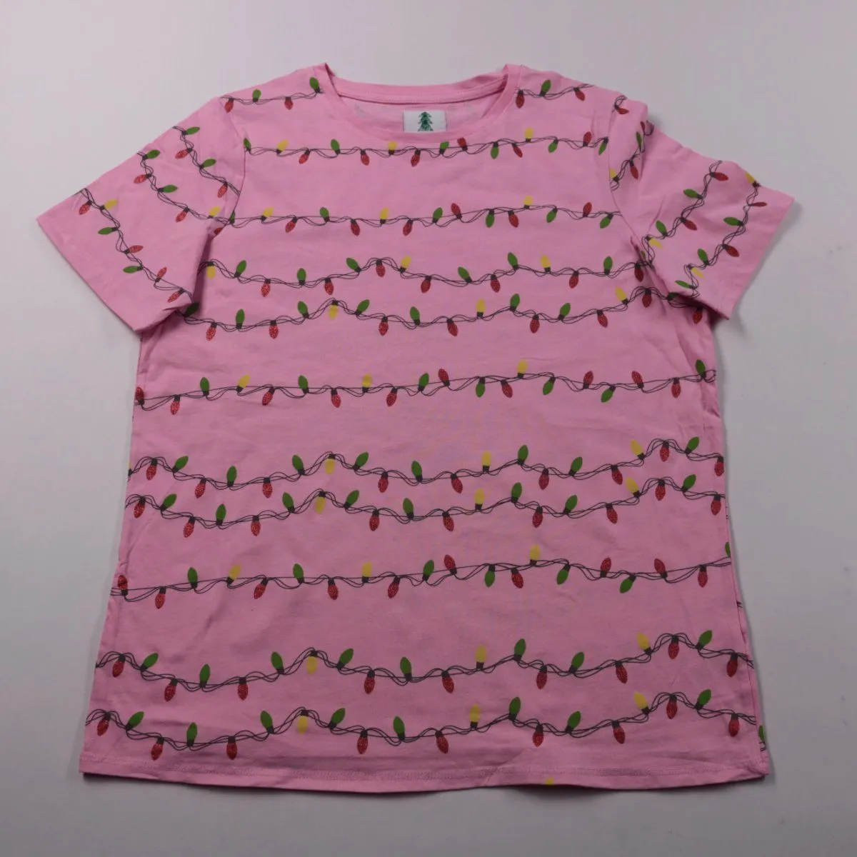Футболка George розового цвета с принтом гирлянд по всей поверхности. Подойдёт для повседневной носки летом и для домашних образов. Натуральный хлопок хорошо пропускает воздух и комфортен в носке.