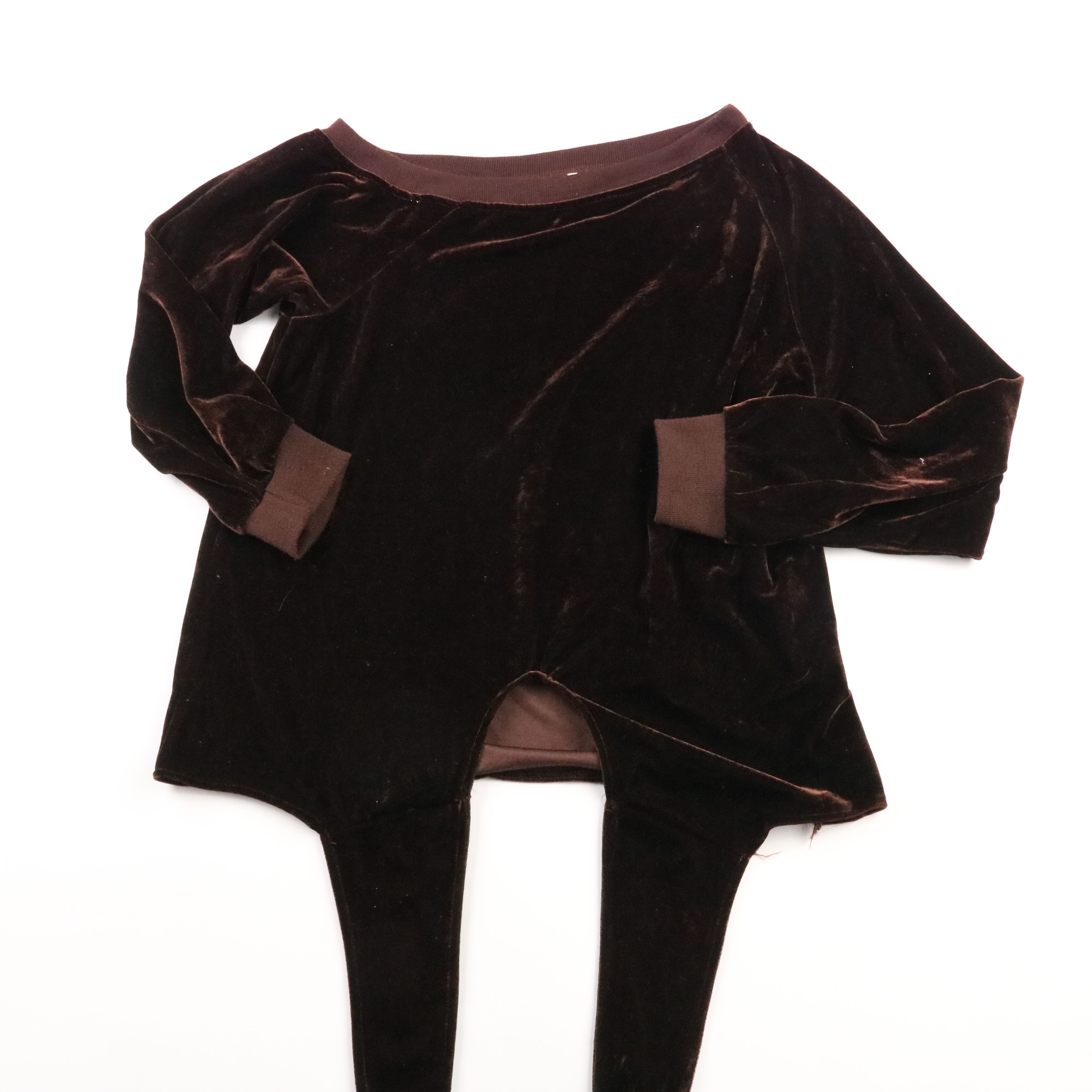 Бархатный комбинезон для девочки тёмно-коричневого цвета с длинными рукавами и манжетами. Подойдёт для дома, утренников и прогулок в прохладную погоду как комфортный слой. Ткань мягкая и тянется, поэтому не стесняет движений.