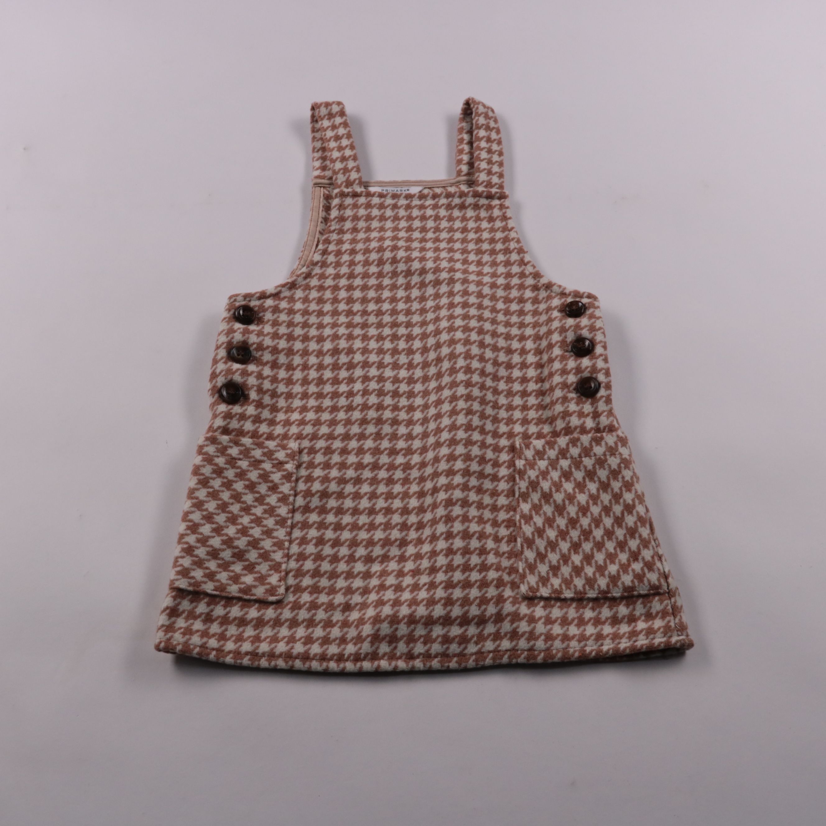 Сарафан-платье Primark в клетку «гусиная лапка» коричнево-бежевого цвета, на широких бретелях. Подойдёт для прохладной погоды в садик или на прогулки, удобно носить с водолазкой/лонгсливом. Практичные накладные карманы и застёжка на пуговицах по бокам.