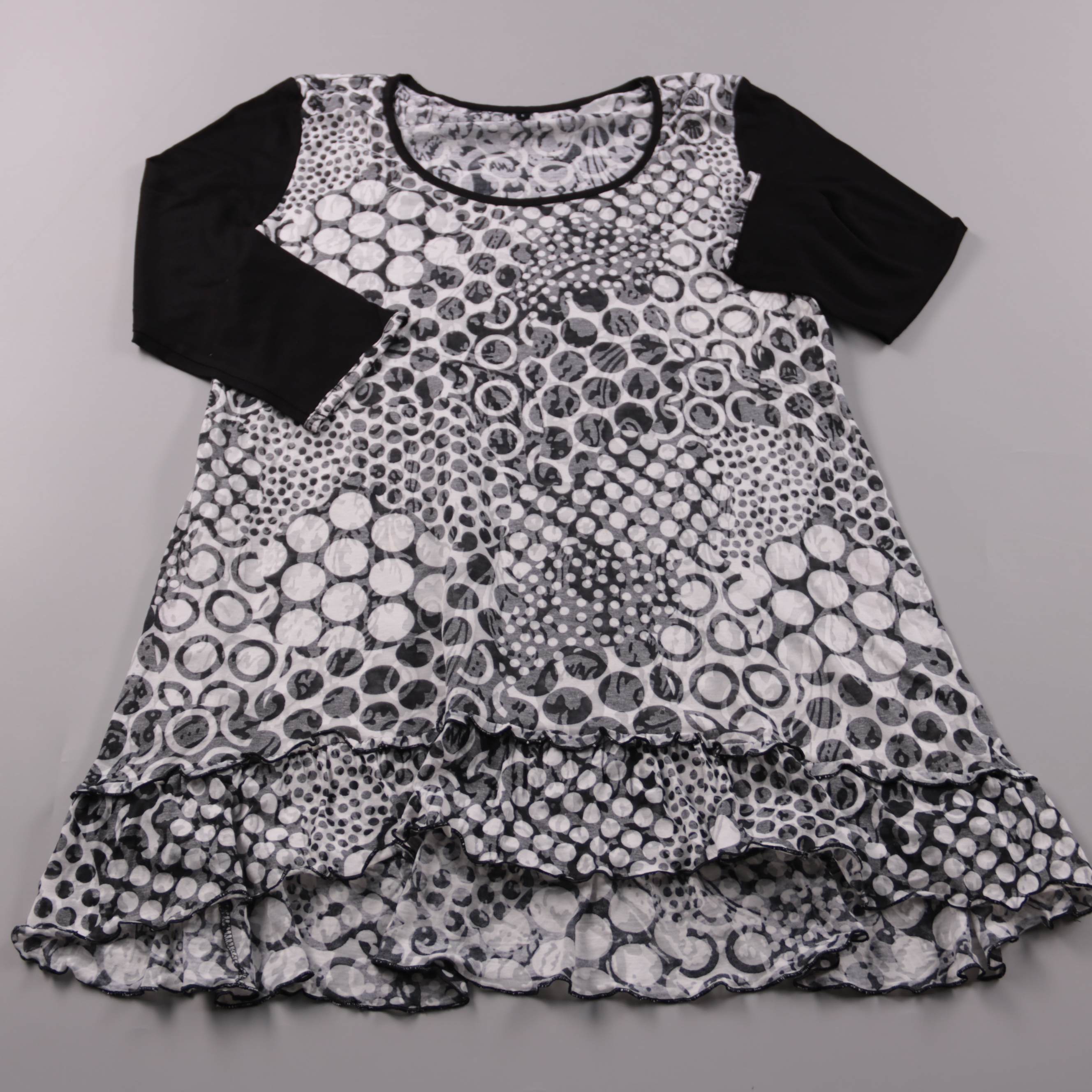 Лёгкое платье для девочки с чёрно-белым узором в горошек и однотонными чёрными рукавами. Подойдёт для лета и тёплой погоды, на прогулки и повседневную носку. Ткань эластичная, не сковывает движения и удобно сидит.