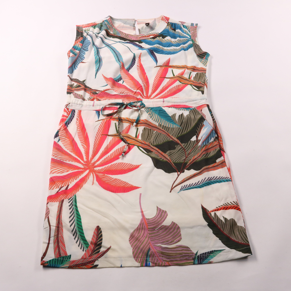 Платье NED без рукавов, с ярким тропическим принтом и поясом на талии. Подойдёт для прогулок и праздников в тёплую погоду. Ткань лёгкая, почти не мнётся и быстро сохнет.