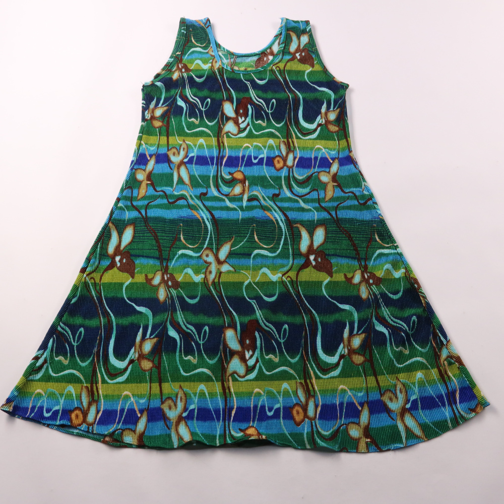 Детское платье без рукавов с разноцветным принтом в зелёно-сине-жёлтых тонах. Подойдёт для лета, прогулок и отдыха, благодаря свободному А-силуэту не сковывает движения. Ткань из полиэстера быстро сохнет и почти не мнётся.