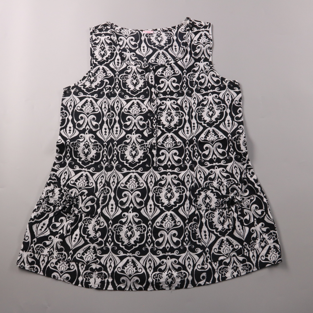 Платье Laura T. без рукавов, с чёрно-белым орнаментальным принтом и небольшим разрезом/завязкой у горловины. Подойдёт для прогулок и праздников в тёплую погоду, можно носить с сандалиями или балетками. Лёгкая ткань и свободный крой не сковывают движения.