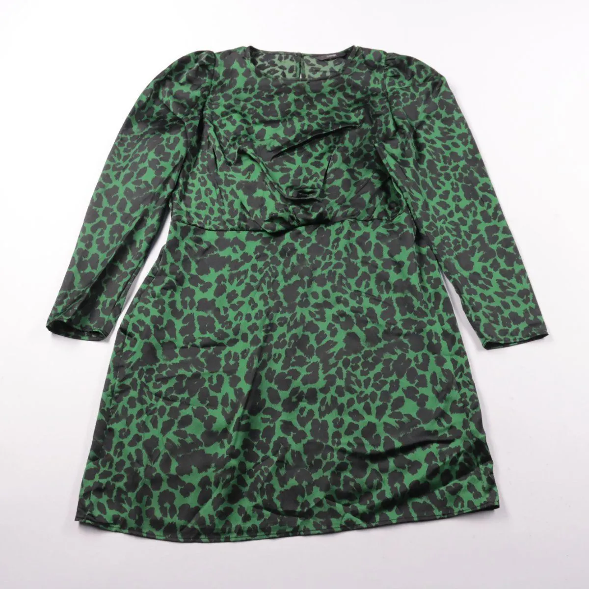 Платье George с длинными рукавами, зелёно-чёрным леопардовым принтом и декоративной оборкой спереди. Подойдёт для праздника, фотосессии или повседневной носки в прохладную погоду. Полиэстеровая ткань почти не мнётся и быстро сохнет.