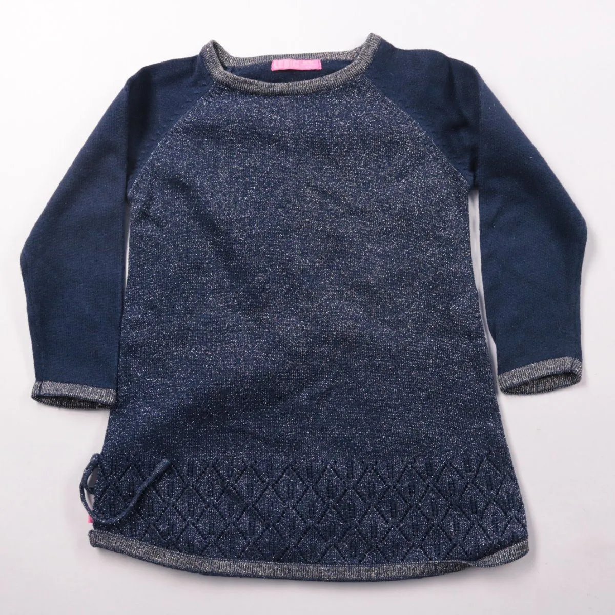 Платье Little тёмно-синего цвета с длинным рукавом и мягкой трикотажной фактурой с лёгким блеском. Внизу простёжка ромбами и боковая утяжка на шнурке, подойдёт для садика и прогулок в прохладную погоду. Практично тем, что не сковывает движения и легко сочетать с леггинсами/колготками.
