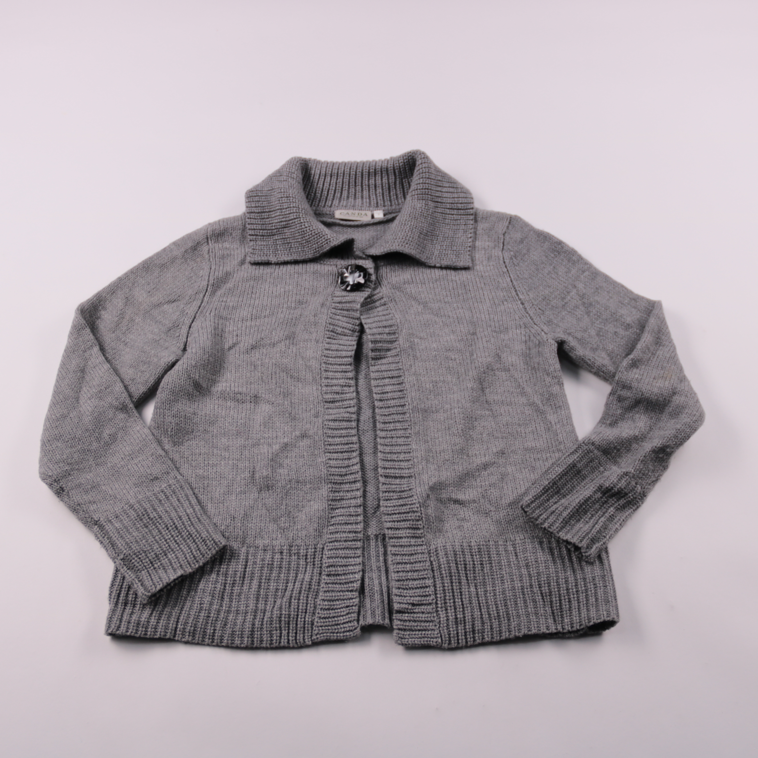 Вязаная кофта Canda серого цвета с отложным воротником и застёжкой на одну декоративную пуговицу. Подойдёт для школы и повседневной носки в прохладную погоду, удобно надевать поверх футболки или блузки. Плотная вязка помогает сохранять тепло и не сковы...