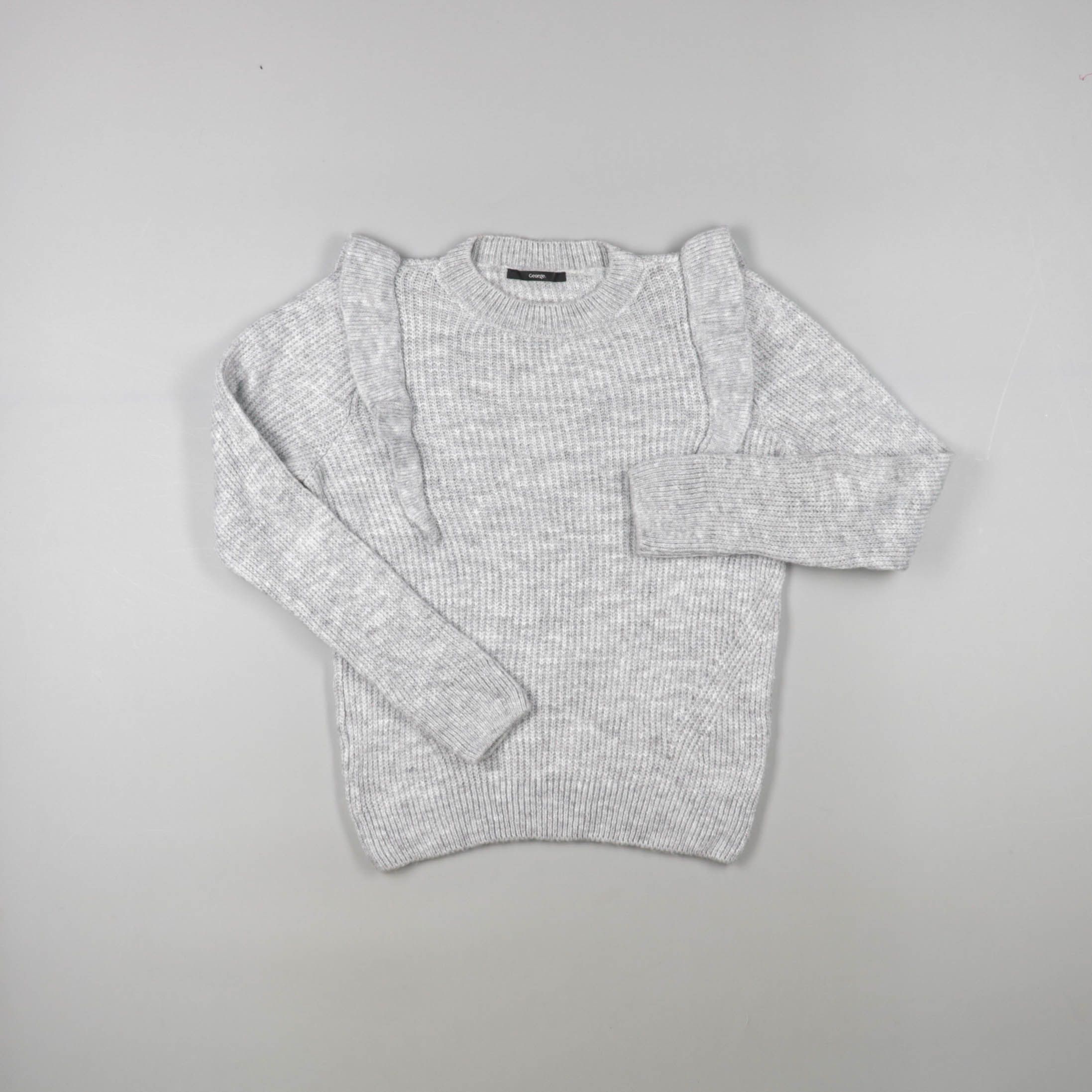 Вязаный свитер George светло-серого цвета с декоративными воланами на плечах. Подойдёт для школы и прогулок в прохладную погоду, легко сочетается с юбкой или джинсами. Мягкая вязка хорошо тянется и не сковывает движения.
