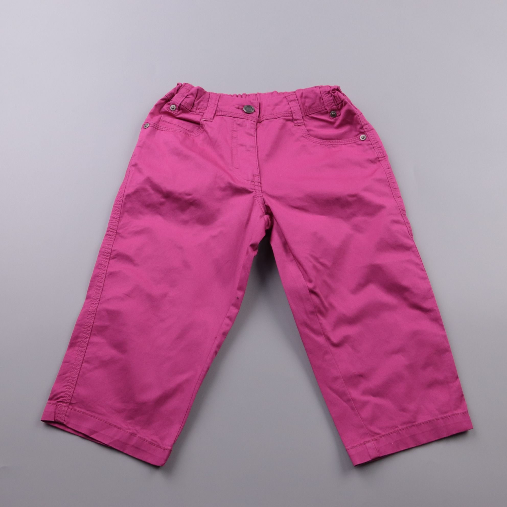 Детские брюки для девочки, укороченная длина и яркий розовый цвет. Подойдут для повседневной носки в тёплую погоду, есть карманы и застёжка на пуговицу. Хлопковая ткань с добавлением эластана тянется и не стесняет движения.
