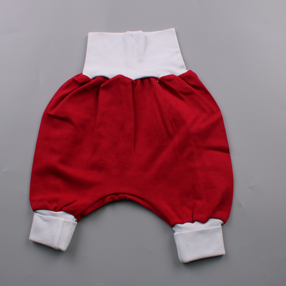 Детские брюки-шаровары красного цвета с широкими белыми манжетами на поясе и по низу штанин. Подойдут для дома, прогулок и сна, не сковывают движения благодаря свободному крою. Широкий мягкий пояс удобно сидит на животике и легко надевается.