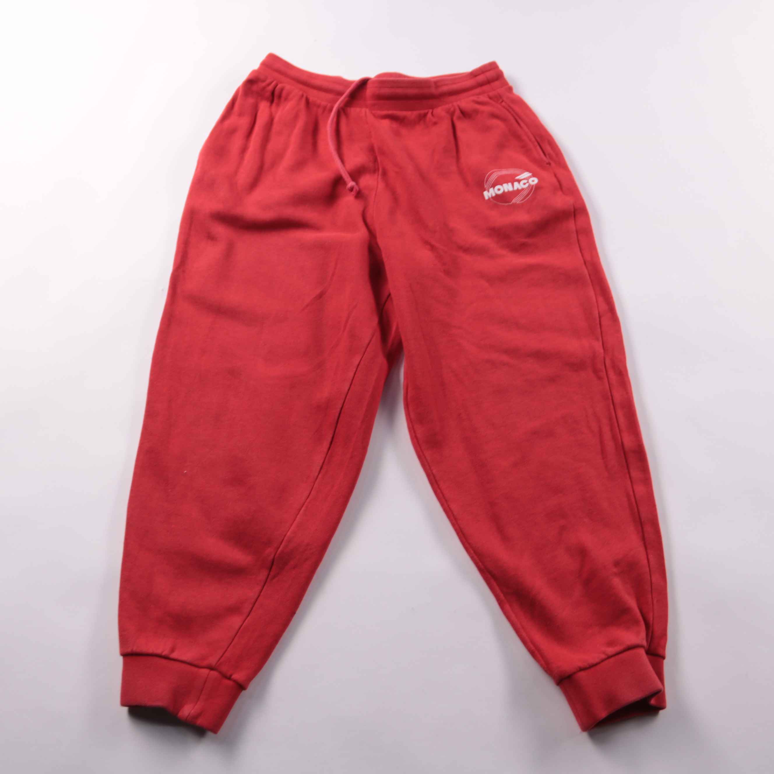 Спортивные брюки ASOS Design красного цвета с поясом на кулиске и манжетами снизу. Подойдут для прогулок, школы или занятий спортом, есть принт MONACO на бедре. Мягкий трикотаж комфортно сидит и не сковывает движения.