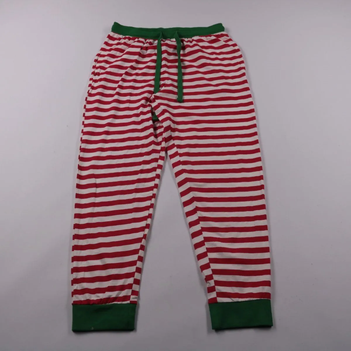 Детские брюки Threadbare в красно-белую полоску с зелёным поясом и манжетами, на кулиске. Подойдут для дома, сна или новогодних тематических образов. Мягкая ткань и эластичный пояс обеспечивают удобную посадку и свободу движений.