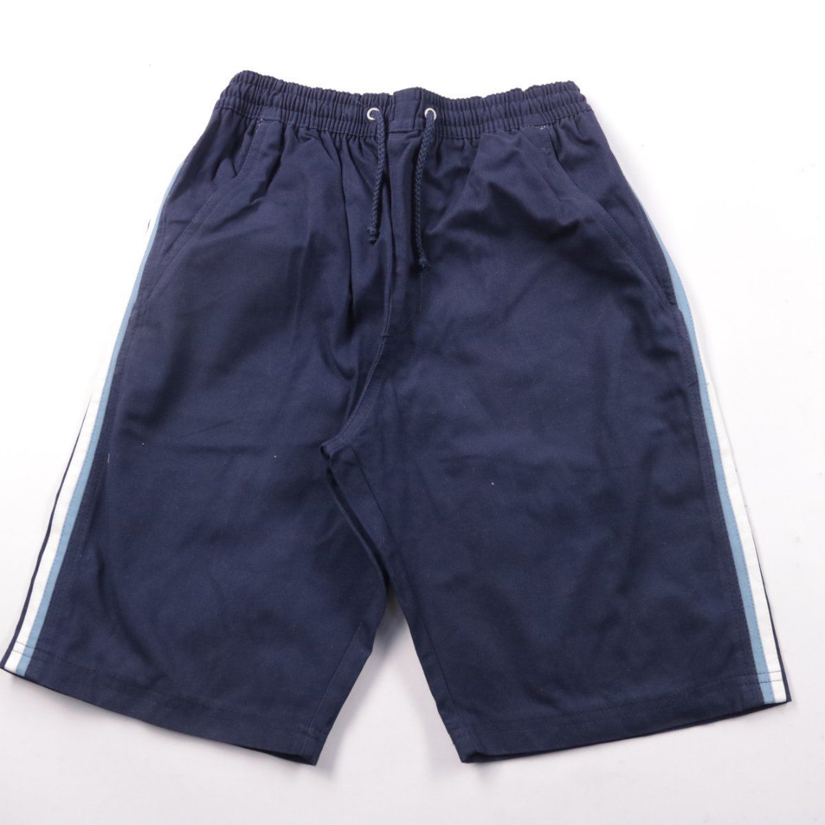 Хлопковые шорты для мальчика, без указанного бренда, тёмно-синего цвета с боковыми полосами и шнурком на поясе. Подойдут для прогулок, спорта и повседневной носки в тёплую погоду. Эластичный пояс помогает удобно подогнать посадку.