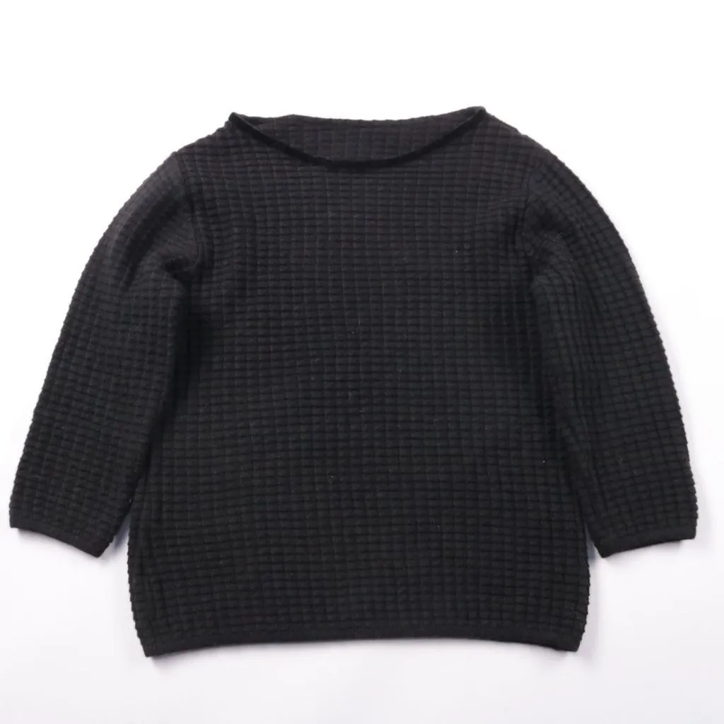 Чёрный детский джемпер с фактурной «вафельной» вязкой и округлым вырезом. Подойдёт для школы и повседневной носки в прохладную погоду. Материал с добавлением синтетики практичен в уходе и хорошо держит форму.
