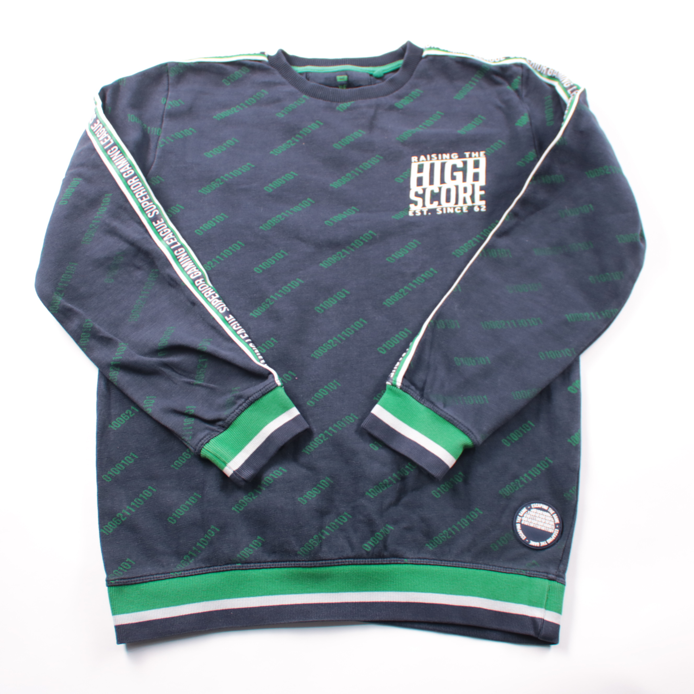 Толстовка WE для мальчика тёмно-синего цвета с зелёными манжетами и принтами. Подойдёт для школы и прогулок в прохладную погоду, удобно носить в демисезон. Мягкий трикотаж и эластичные резинки по низу и рукавам помогают вещи хорошо сидеть и сохранять т...
