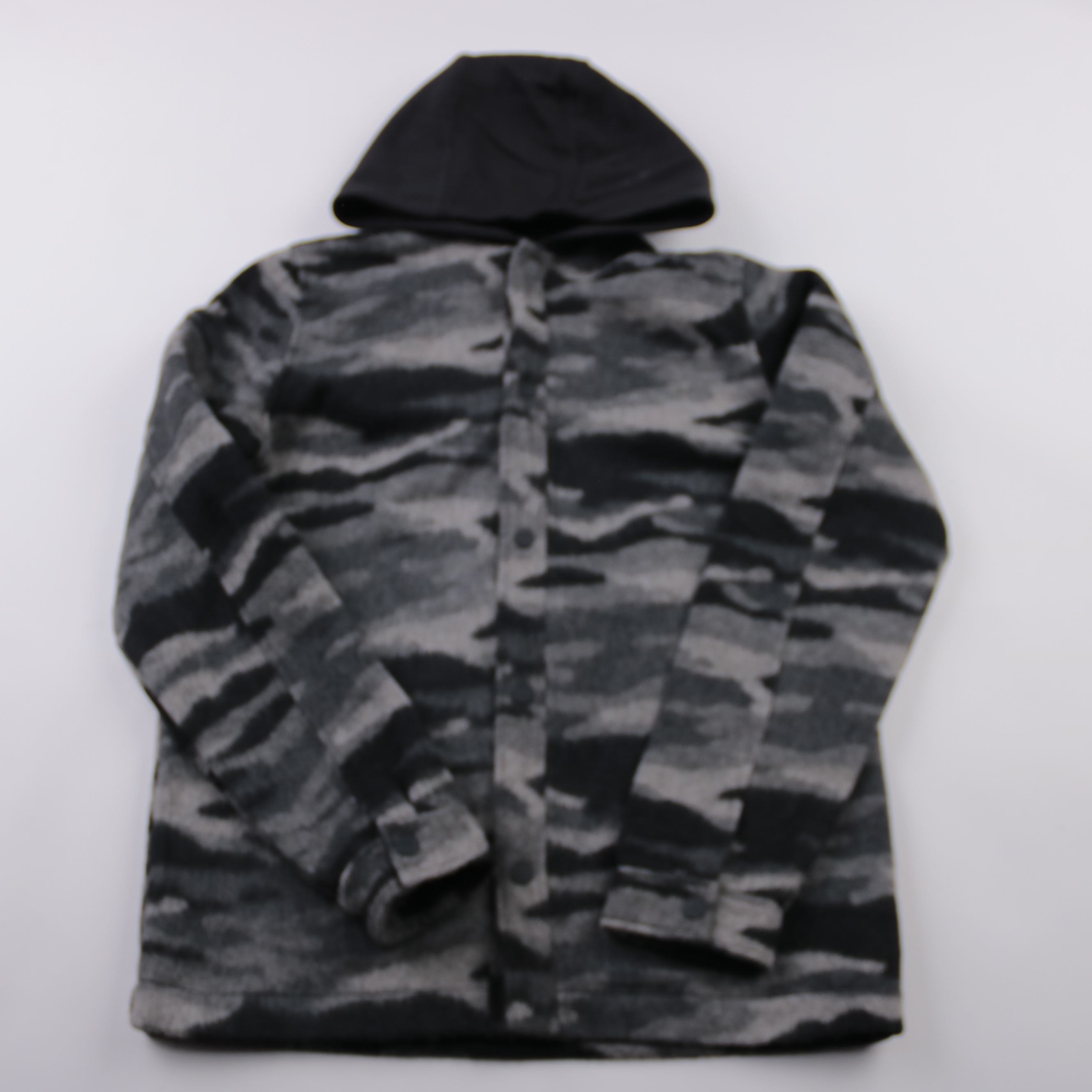 Куртка F&F для мальчика с капюшоном и застёжкой на кнопки, выполнена в серо-чёрном камуфляжном принте. Подойдёт для школы и прогулок в прохладную погоду. Практичный материал прост в уходе и хорошо носится.