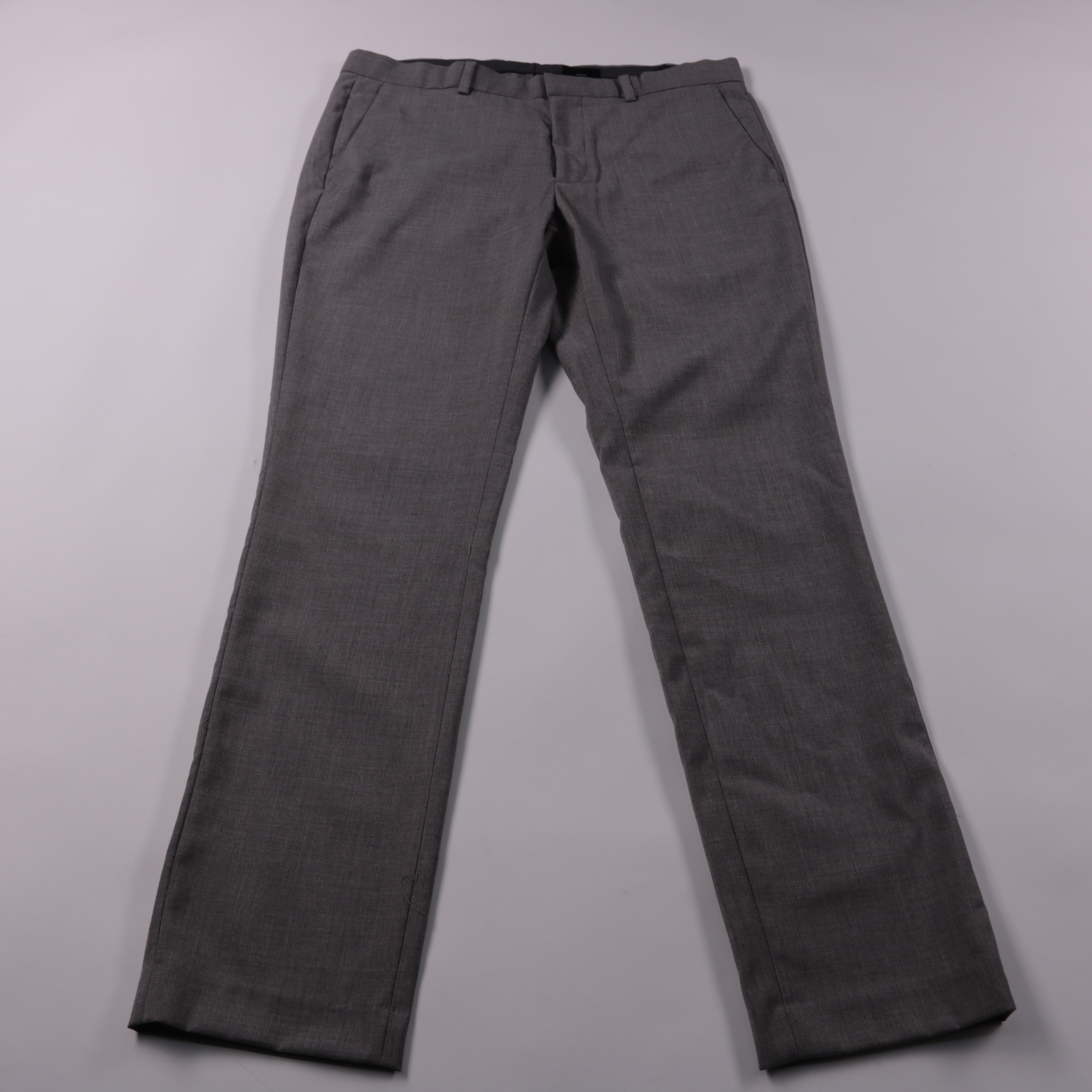 Мужские брюки H&M Slim Fit серого цвета, аккуратная посадка и ровные штанины. Подойдут для офиса и повседневных образов с рубашкой или свитером. Практичный плюс — ткань из полиэстера с вискозой меньше мнётся и проще в уходе.