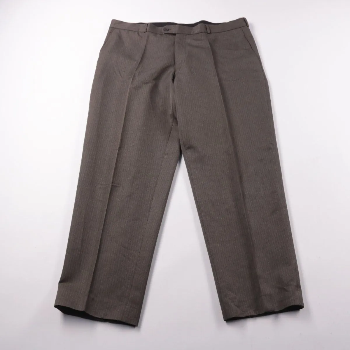 Мужские классические брюки без указанного бренда, серого цвета с тонкой фактурой и защипами спереди. Подойдут для офиса, деловых встреч и формальных образов. Практичный материал из 100% полиэстера меньше мнётся и проще в уходе.