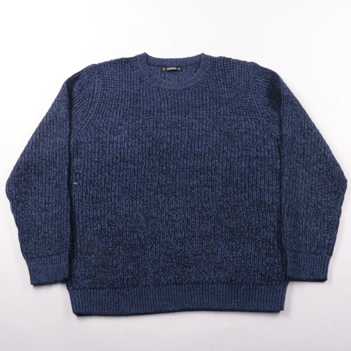 Мужской вязаный свитер Dunnes синего цвета с круглым вырезом и плотной фактурной вязкой. Подойдёт для повседневной носки в прохладную погоду, удобно носить как самостоятельный слой или под куртку. Практичен тем, что тёплый и неприхотливый в уходе за счёт смеси акрила и шерсти.
