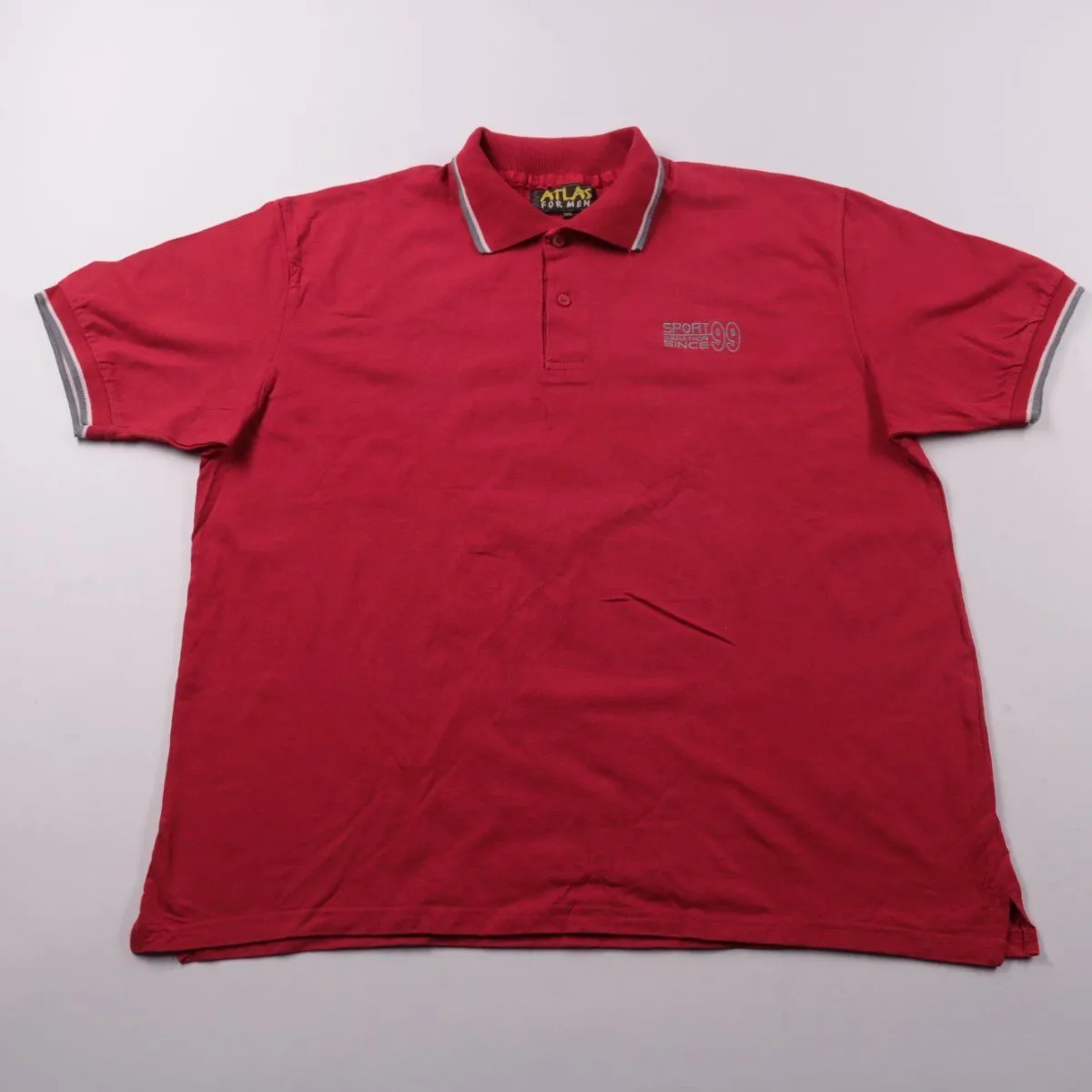 Мужское поло Atlas красного цвета с воротником на пуговицах и небольшим принтом на груди. Подойдёт для повседневной носки летом и в тёплый демисезон под куртку или ветровку. Практичный плюс — плотный хлопковый трикотаж хорошо держит форму и комфортен в носке.