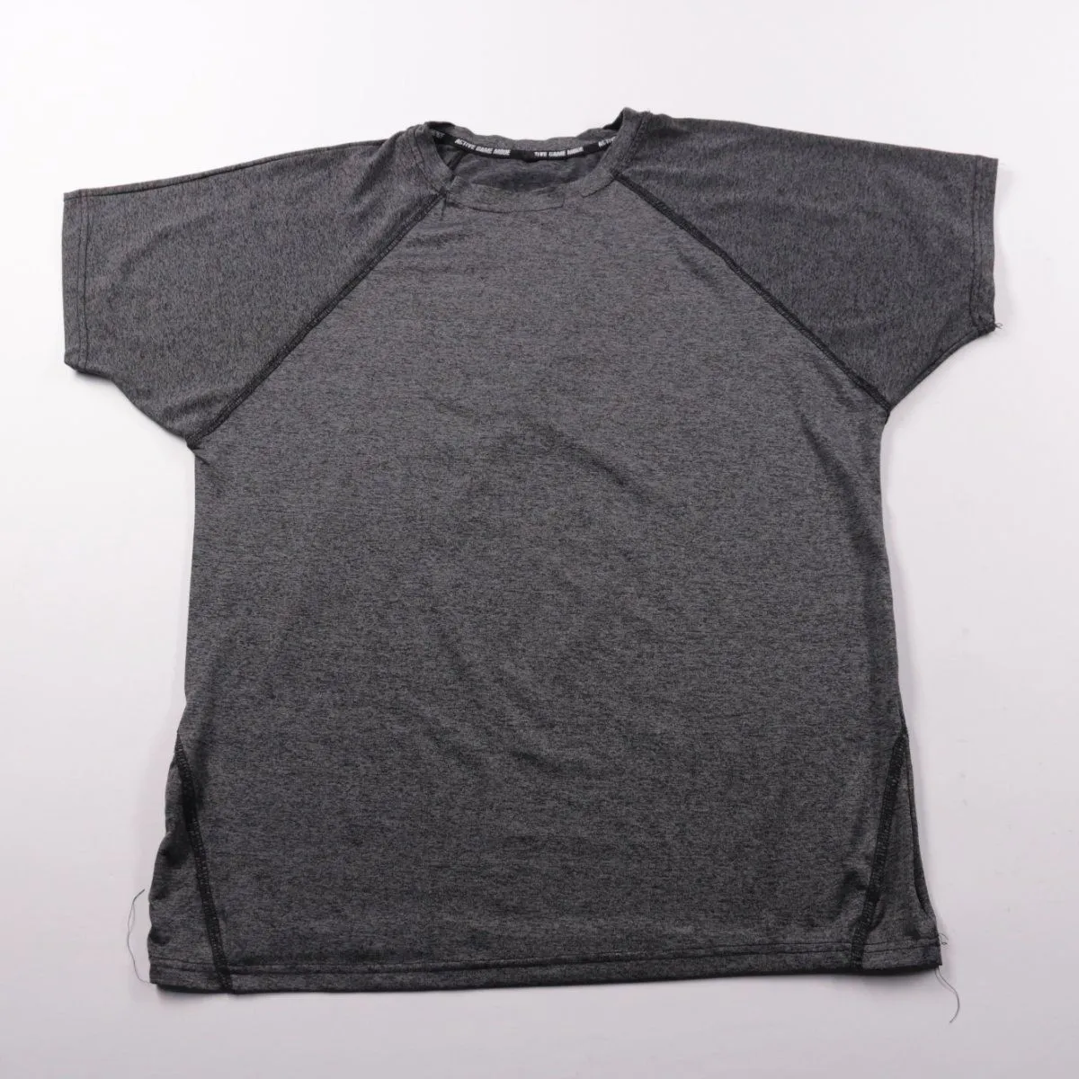 Мужская футболка не указано тёмно-серого меланжа с реглан-рукавом и контрастными швами. Подойдёт для тренировок, пробежек и повседневной носки в тёплое время или как первый слой. Тонкий синтетический материал быстро сохнет и не сковывает движения.