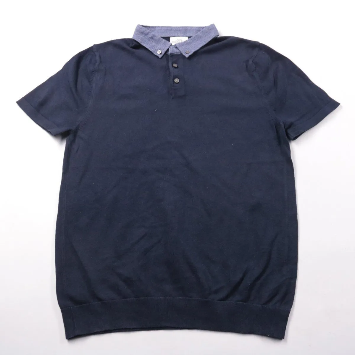 Мужское поло Next тёмно-синего цвета с контрастным воротником на пуговицах. Подойдёт для повседневных образов и офиса в стиле casual. Трикотаж на основе хлопка приятен к телу и хорошо держит форму.