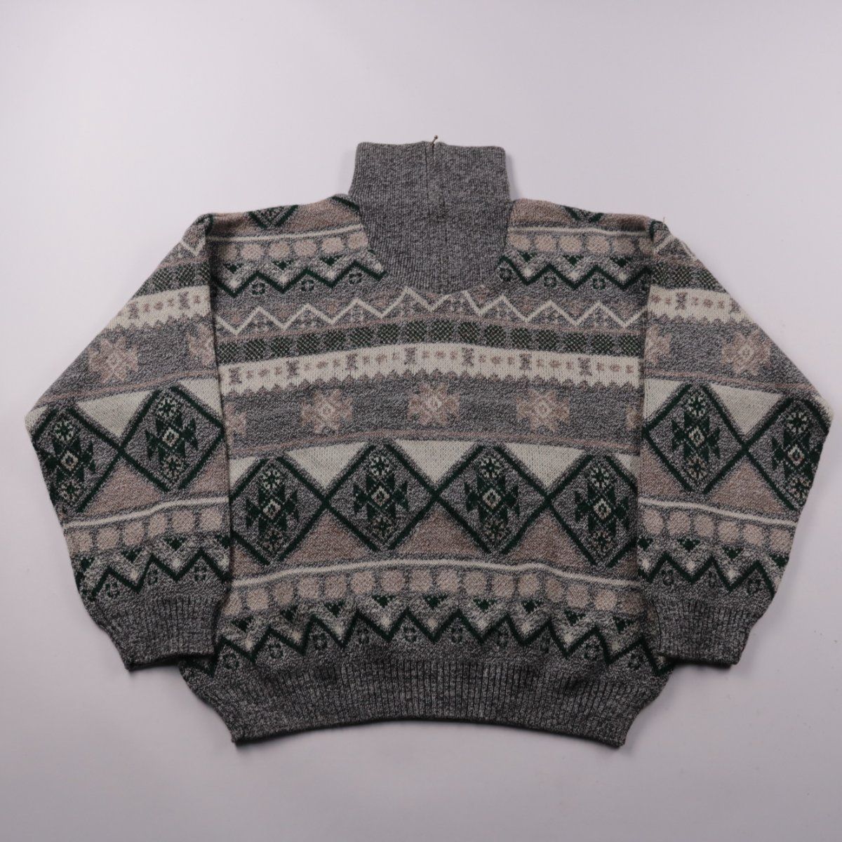 Мужской вязаный свитер с высоким воротником-стойкой и геометрическим жаккардовым узором, бренд не указан. Подойдёт для зимы и холодной погоды на каждый день, хорошо смотрится с джинсами и брюками. Практичный плюс — тёплый воротник и неприхотливый в уходе акрил.
