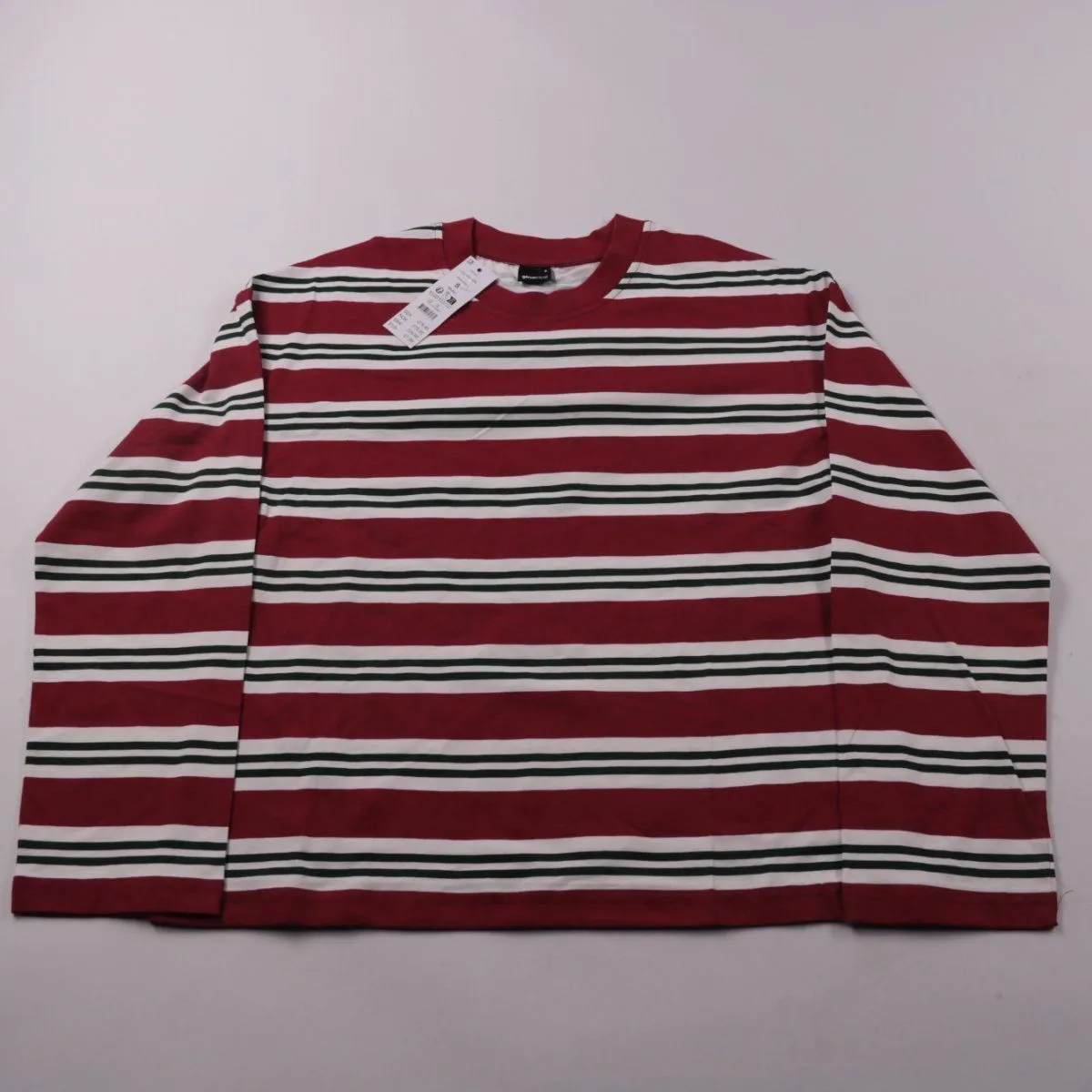 Лонгслив Gina Tricot в бордово-бело-зелёную полоску с круглым вырезом. Подойдёт для повседневных образов и как базовый слой в прохладную погоду. Натуральный хлопок хорошо дышит и комфортен в носке.