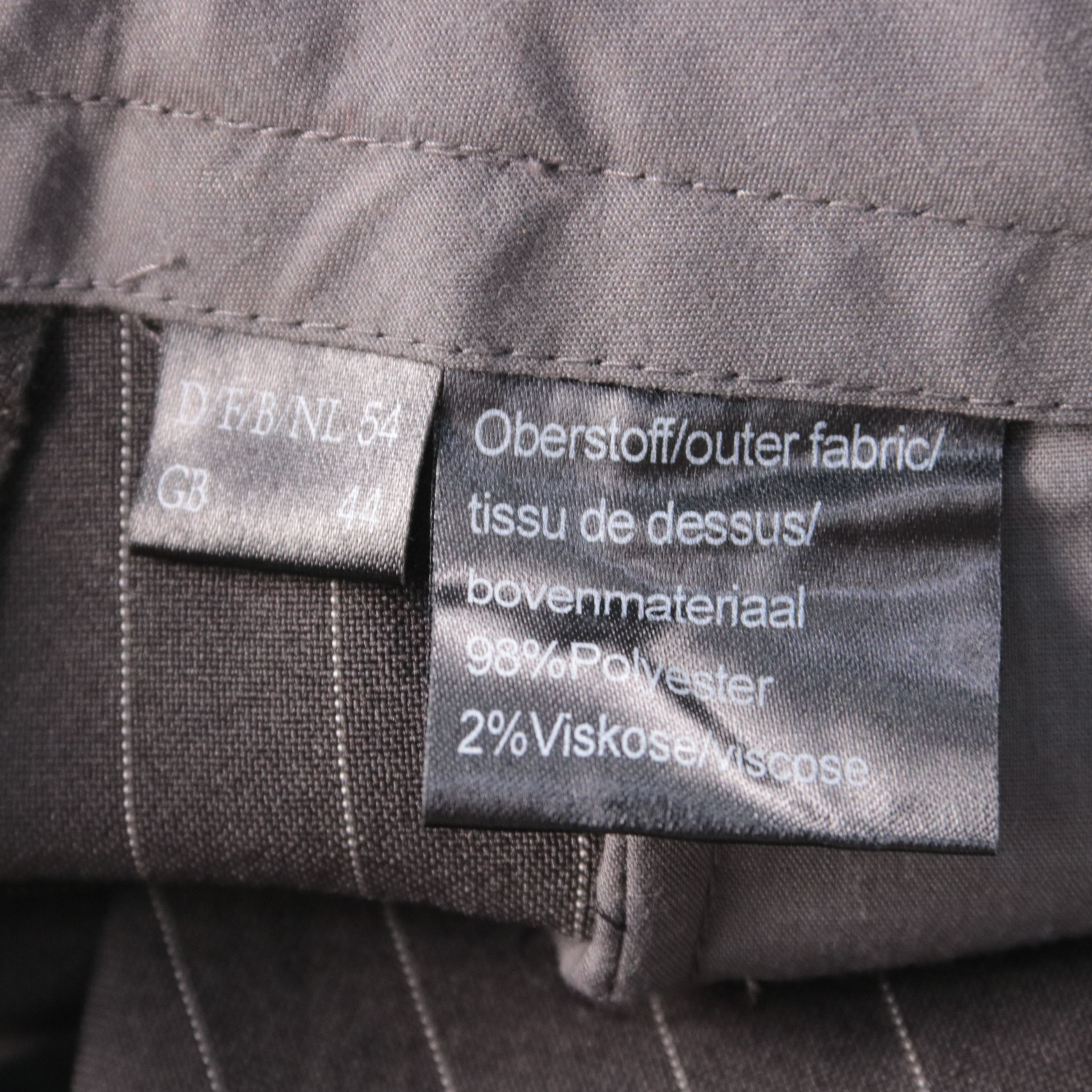 Мужской классический костюм в тёмно-сером цвете с тонкой полоской, пиджак на пуговицах и брюки со стрелками. Подойдёт для офиса, собеседований и торжественных мероприятий. Практичный синтетический состав почти не мнётся и проще в уходе.
