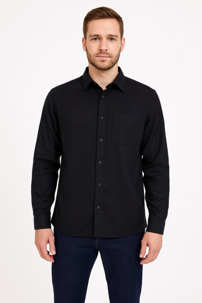 Мужская рубашка Oscar of Sweden чёрного цвета, с длинным рукавом и нагрудным карманом. Подойдёт для офиса и повседневных образов в любое время года. Практична тем, что тёмная ткань менее маркая и легко сочетается с джинсами и брюками.