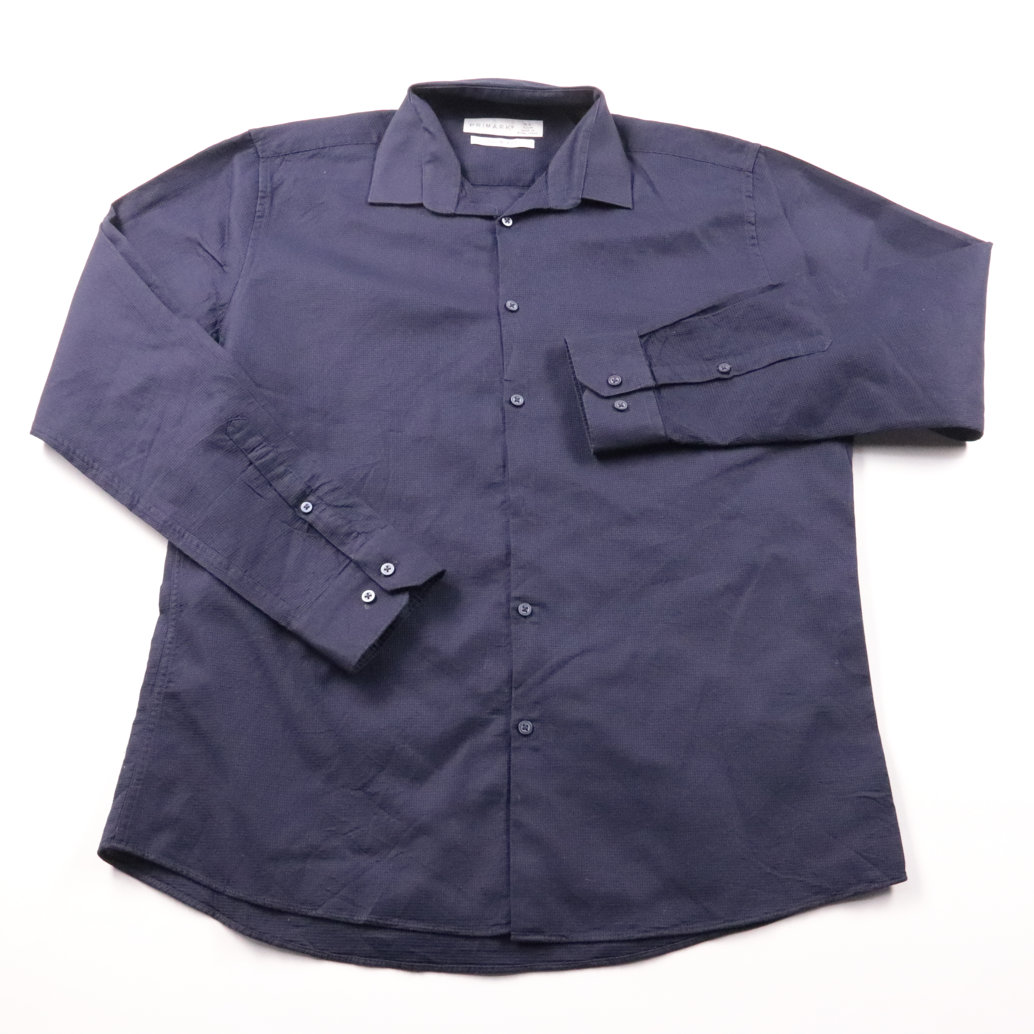 Мужская рубашка Primark Slim Fit тёмно-синего цвета с длинным рукавом и классическим воротником. Подойдёт для офиса, учёбы и повседневных образов с джинсами или брюками. Практичный материал легко сочетается с пиджаком и жилетом.