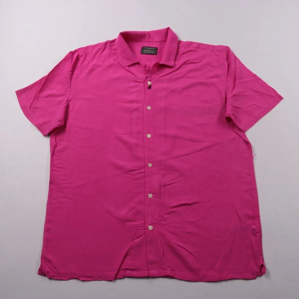 Мужская рубашка Primark Regular Fit ярко-розового цвета с коротким рукавом и застёжкой на пуговицы. Подойдёт для лета, отпуска и повседневных образов в городе. Лёгкая ткань быстро сохнет и удобна в носке.