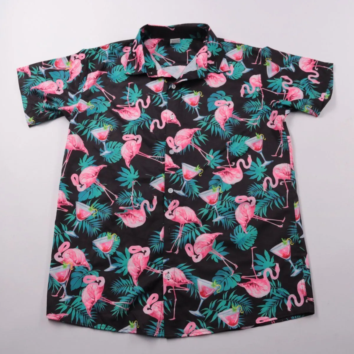 Мужская рубашка с коротким рукавом с ярким тропическим принтом (фламинго и листья), подойдёт для лета, отпуска и пляжных вечеринок. Ткань лёгкая и немного тянется за счёт спандекса, поэтому в ней комфортно двигаться. Практична тем, что быстро сохнет и почти не мнётся.