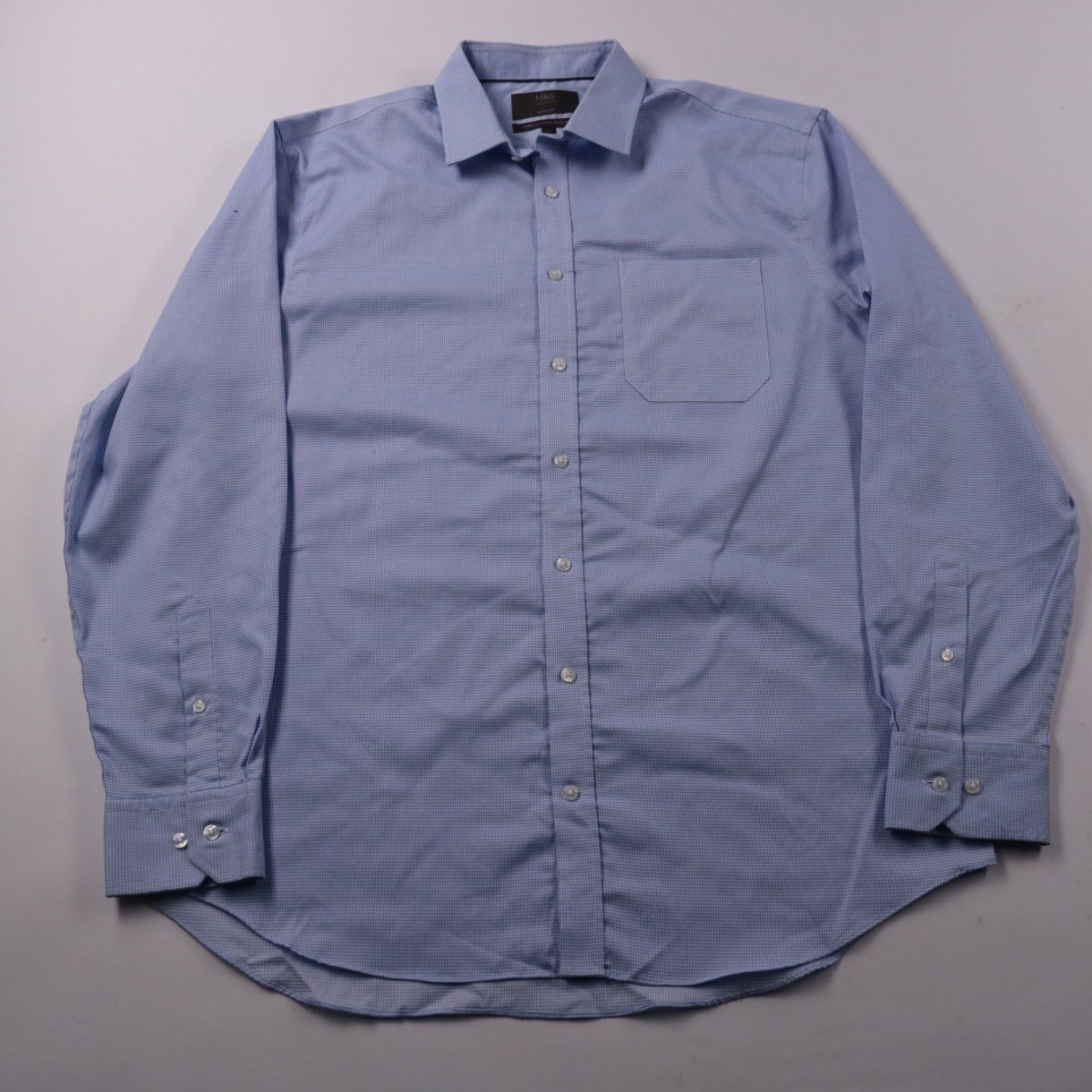 Мужская классическая рубашка M&S Collection Regular из хлопка, голубая в мелкую клетку, с нагрудным карманом и застёжкой на пуговицы. Подойдёт для офиса и повседневных образов в прохладную и тёплую погоду. Практичное преимущество — ткань non-iron, легче разглаживается после стирки.