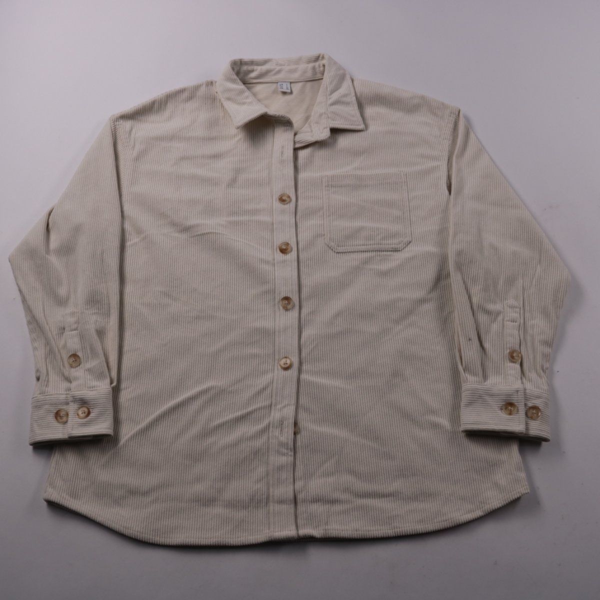 Мужская рубашка светло-бежевого цвета с фактурой в мелкий рубчик, на пуговицах и с нагрудным карманом. Подойдёт для повседневных образов и как верхний слой в прохладную погоду. Практичный плюс — материал из полиэстера проще в уходе и меньше мнётся.