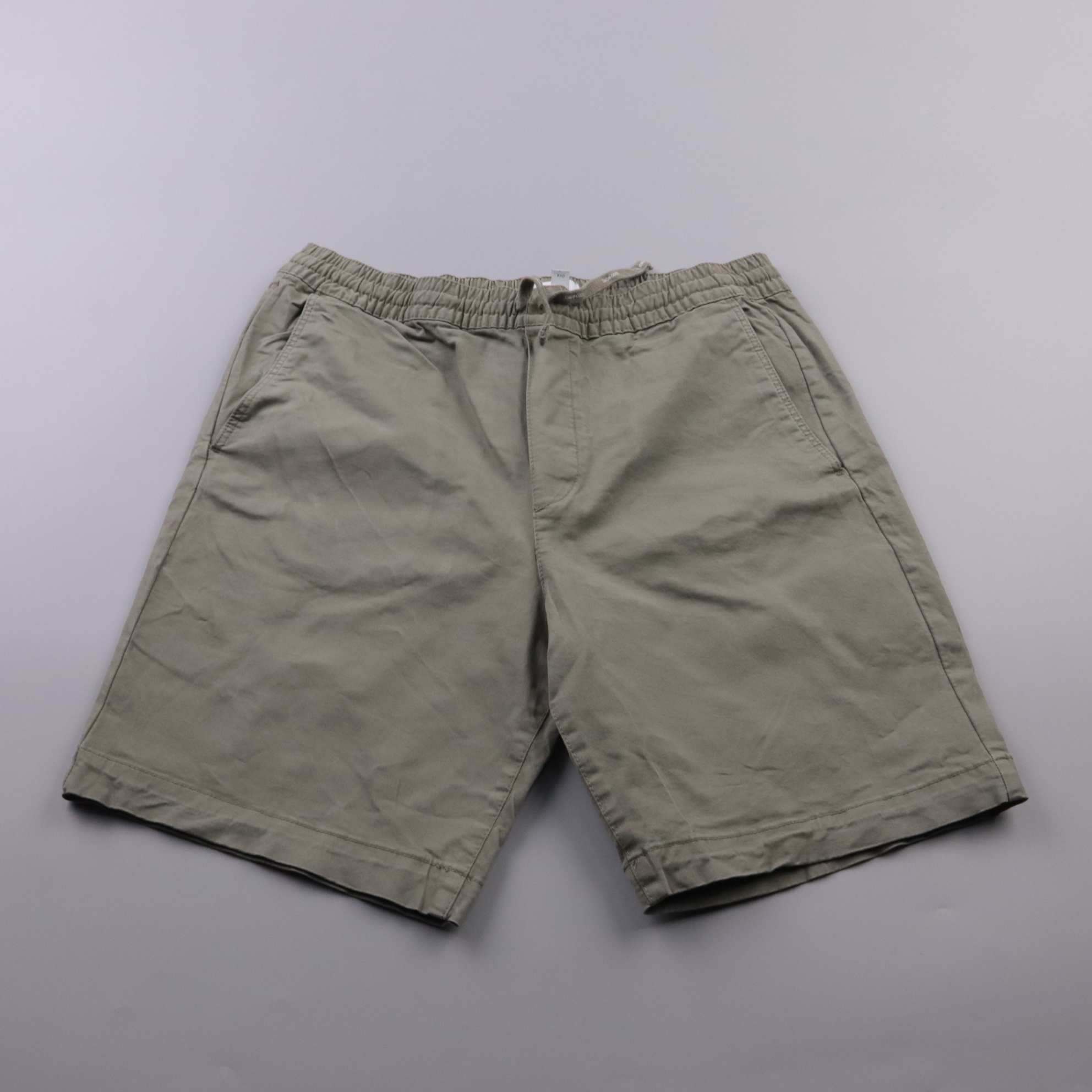 Мужские шорты H&M из хлопковой ткани с эластичным поясом и шнурком, цвет хаки. Подойдут для лета, прогулок и повседневной носки, есть боковые карманы. Пояс на резинке удобно садится по талии и не сковывает движения.