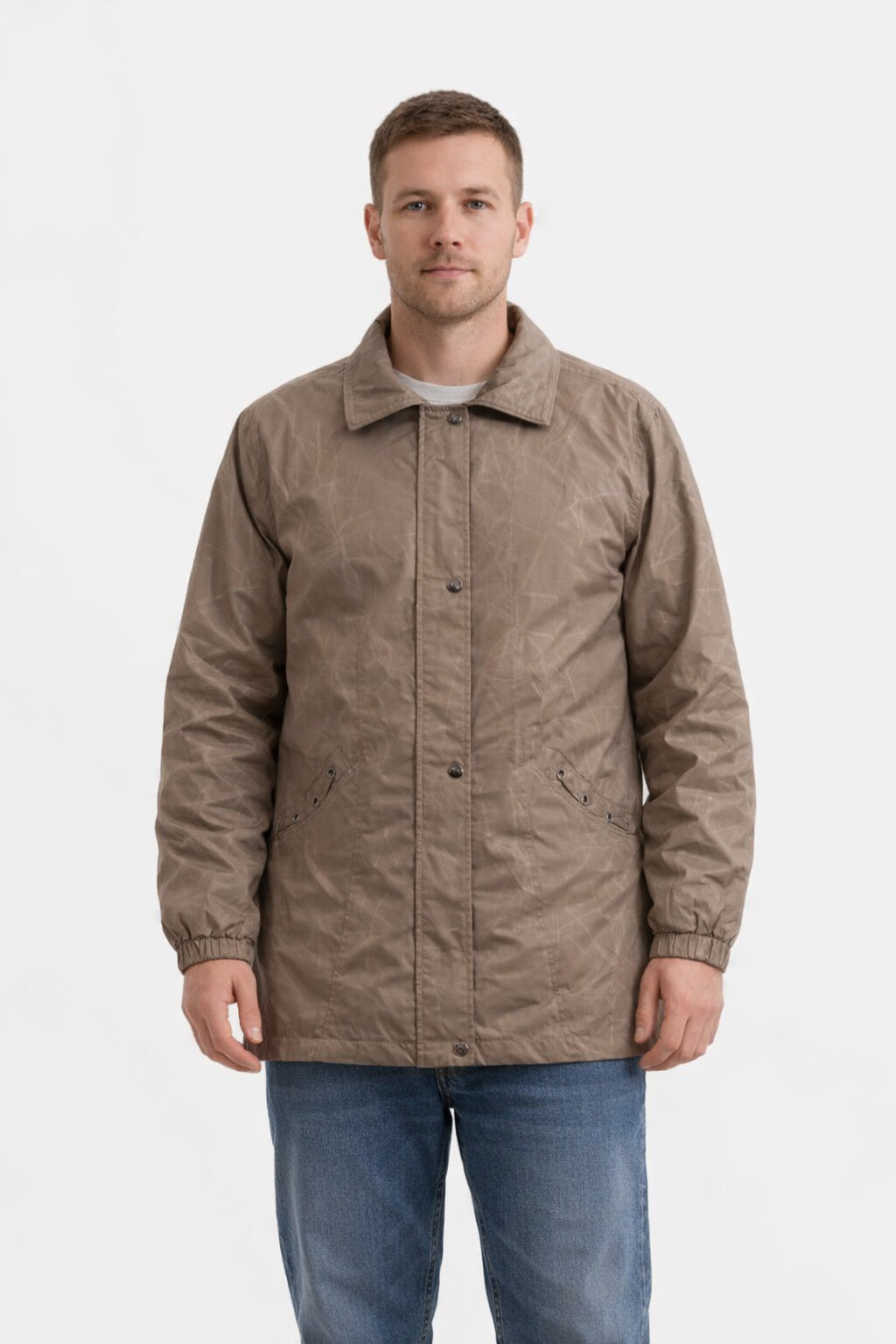 Мужская демисезонная куртка Mian в коричневом цвете с лёгким фактурным принтом и застёжкой на кнопки. Подойдёт для повседневной носки весной и осенью, когда нужна защита от ветра и прохлады. Практичные карманы и эластичные манжеты помогают удобно носит...