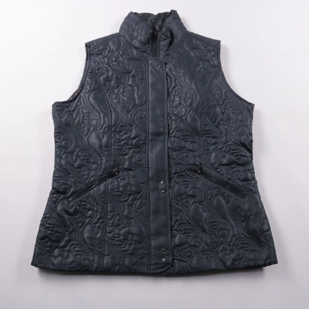 Стёганый женский жилет Jessica Graaf тёмно-синего цвета с рельефным узором и высоким воротником-стойкой. Подойдёт для прогулок и повседневной носки в прохладную погоду, удобно носить поверх свитера или худи. Практичные карманы на молниях и застёжка на ...