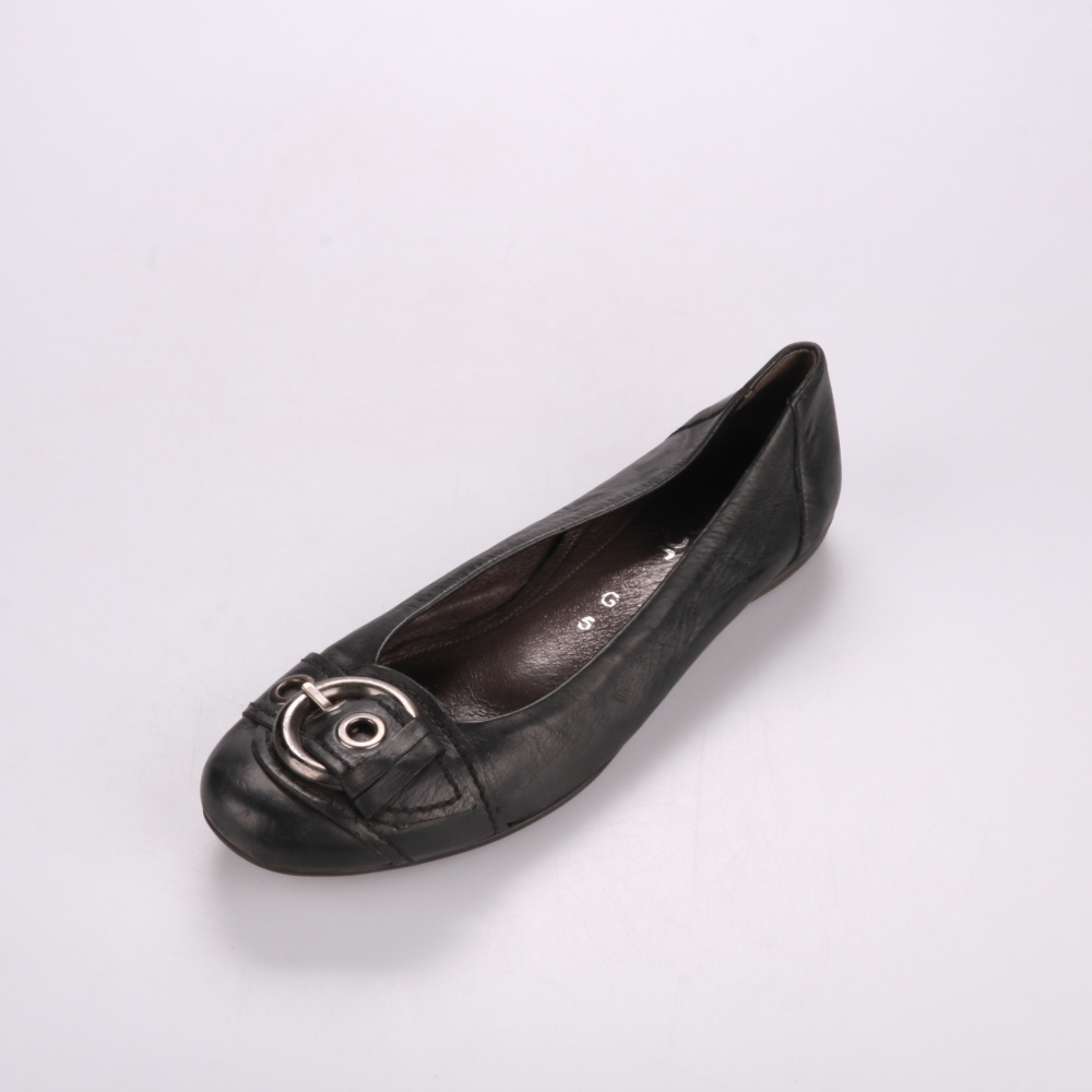 Женские балетки Gabor из натуральной кожи, чёрного цвета, с металлической пряжкой на мысе. Подойдут для офиса и повседневных образов, хорошо смотрятся с брюками и платьями. Мягкая кожа удобно садится по ноге и их легко быстро обувать.