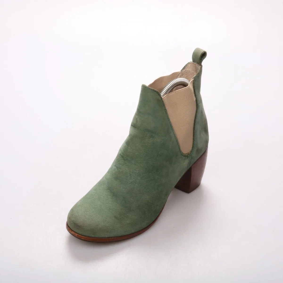 Женские ботильоны из замши зелёного цвета на устойчивом каблуке, с эластичными вставками по бокам. Подойдут для демисезонных образов с джинсами или платьями в стиле casual. Удобно надевать благодаря боковым резинкам и петельке сзади.